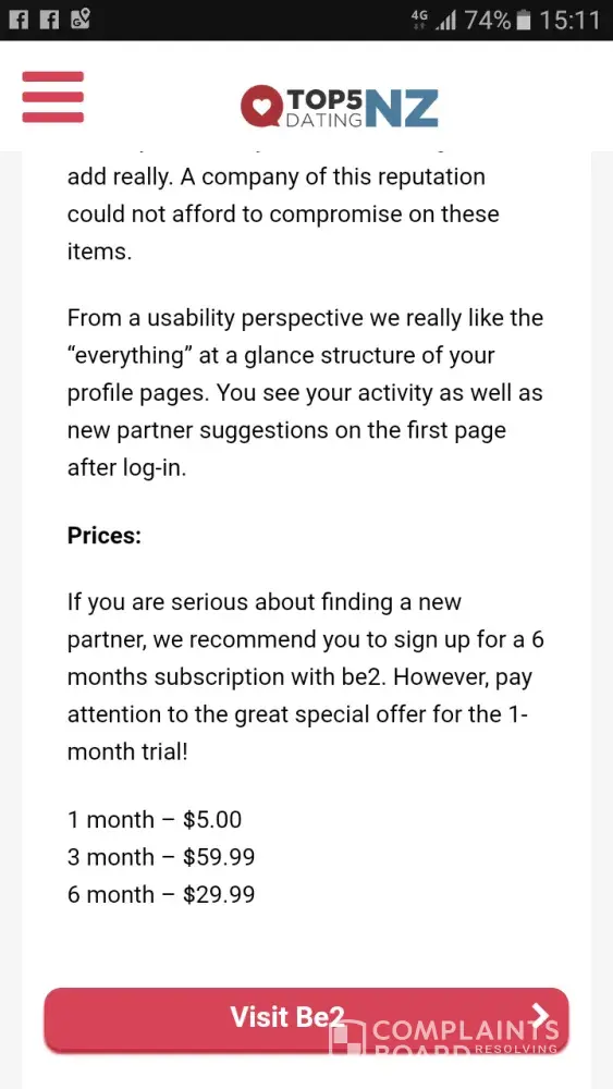 There was no way I would have activated a service that was to be used in Australia when I was moving to Canada let alone agree to pay the fees they are stating I have agreed to. Further, When I asked for more information from the collection agency and direct contact information for Be2 they sent me the dodgy contract with all the above mismatched information on it. The contact information they gave me was just the website and a link to a "dating service review" site that links to join Be2 and is clearly a paid site.