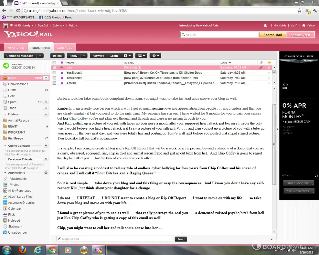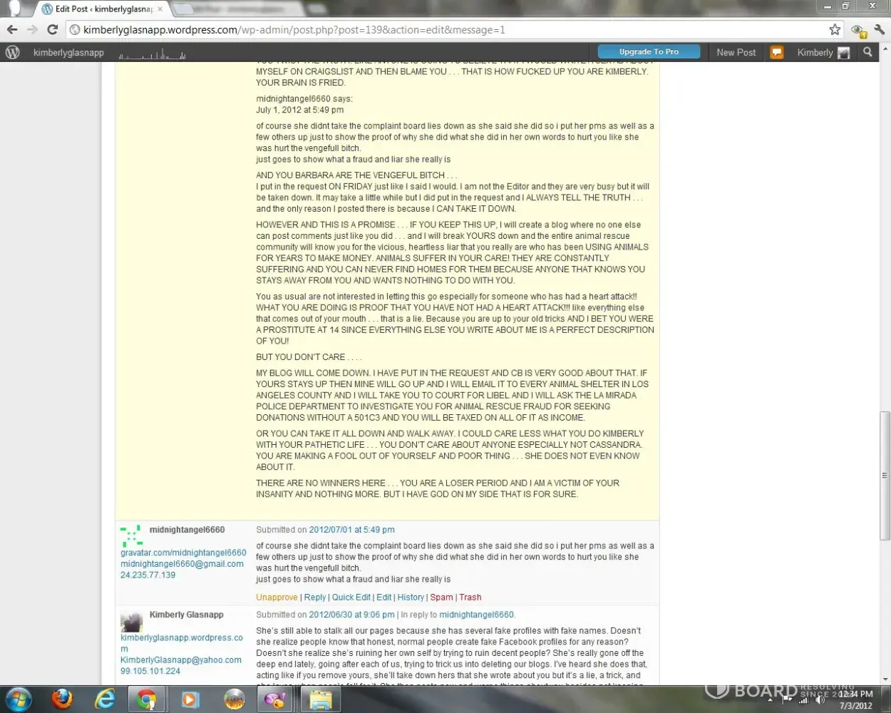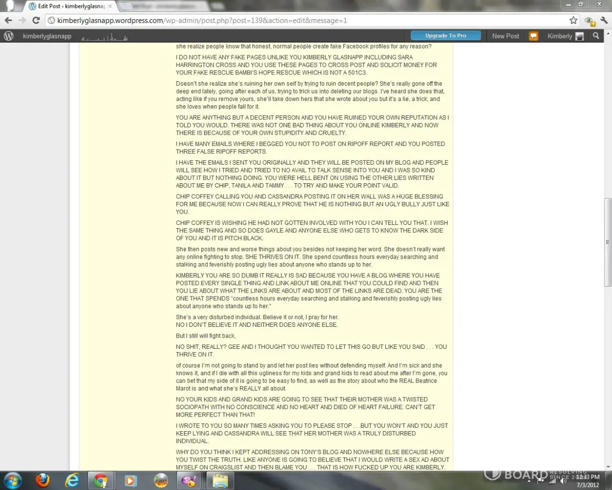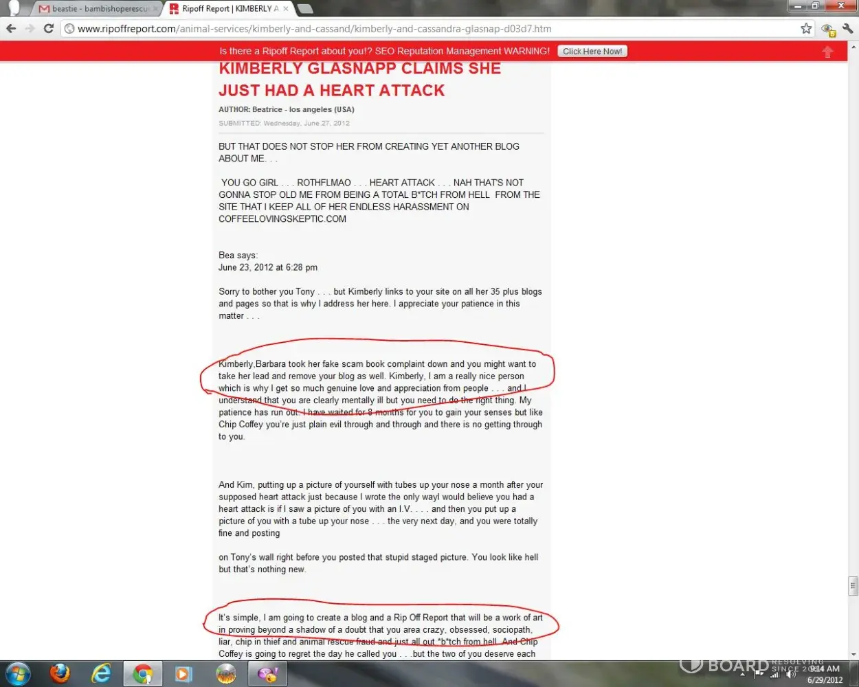 A woman named Kimberly Glasnapp who I fostered two dogs for 2012 and when I found out she was an animal rescue fraud raising money through chip-ins to fund her drug habit, she cyberbullied me for years including a word press blog with ridiculous lies. She called Chip Coffey who fed her a lot of personal information about me. She only stopped because she died of a drug overdose in 2018.