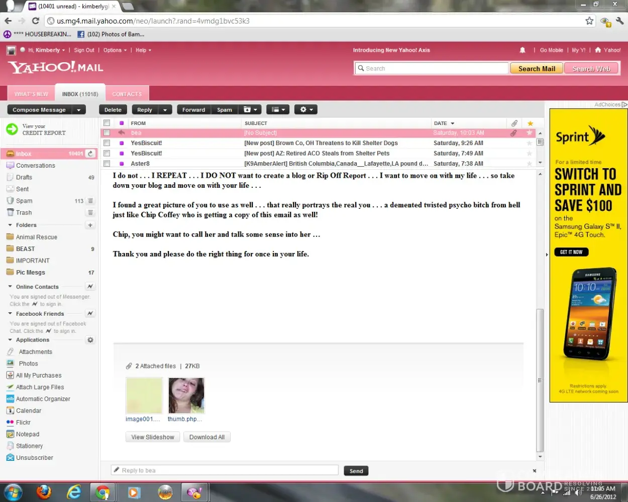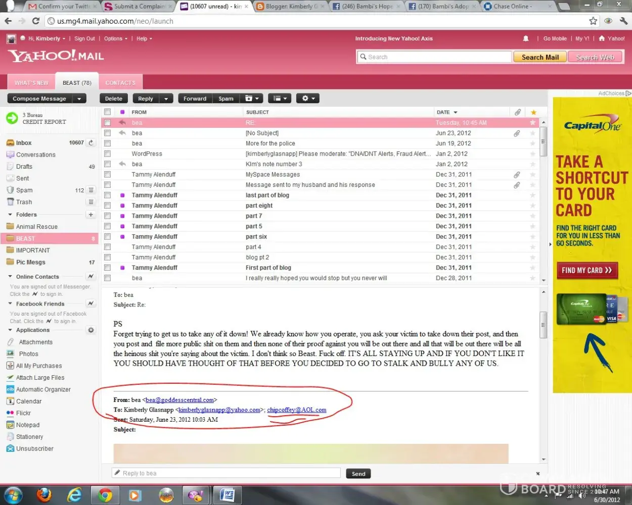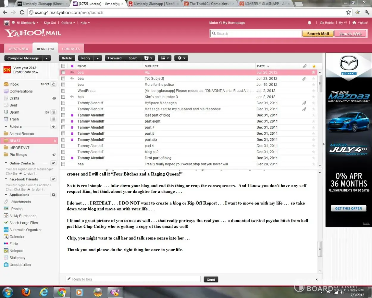A woman named Kimberly Glasnapp who I fostered two dogs for 2012 and when I found out she was an animal rescue fraud raising money through chip-ins to fund her drug habit, she cyberbullied me for years including a word press blog with ridiculous lies. She called Chip Coffey who fed her a lot of personal information about me. She only stopped because she died of a drug overdose in 2018.