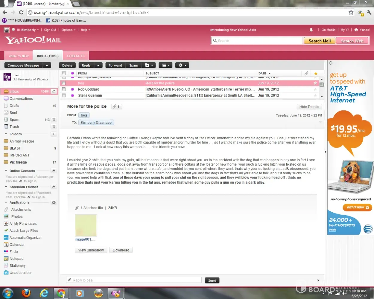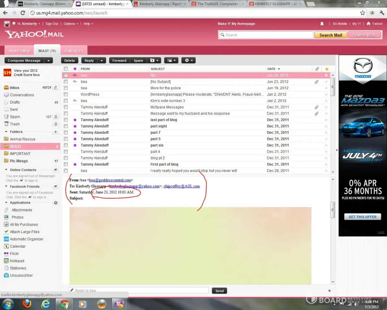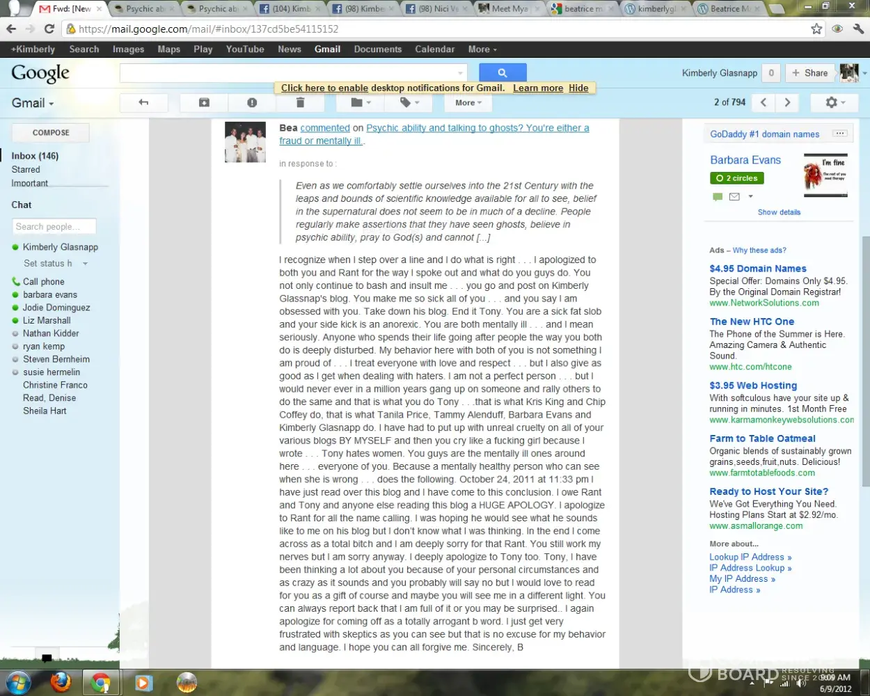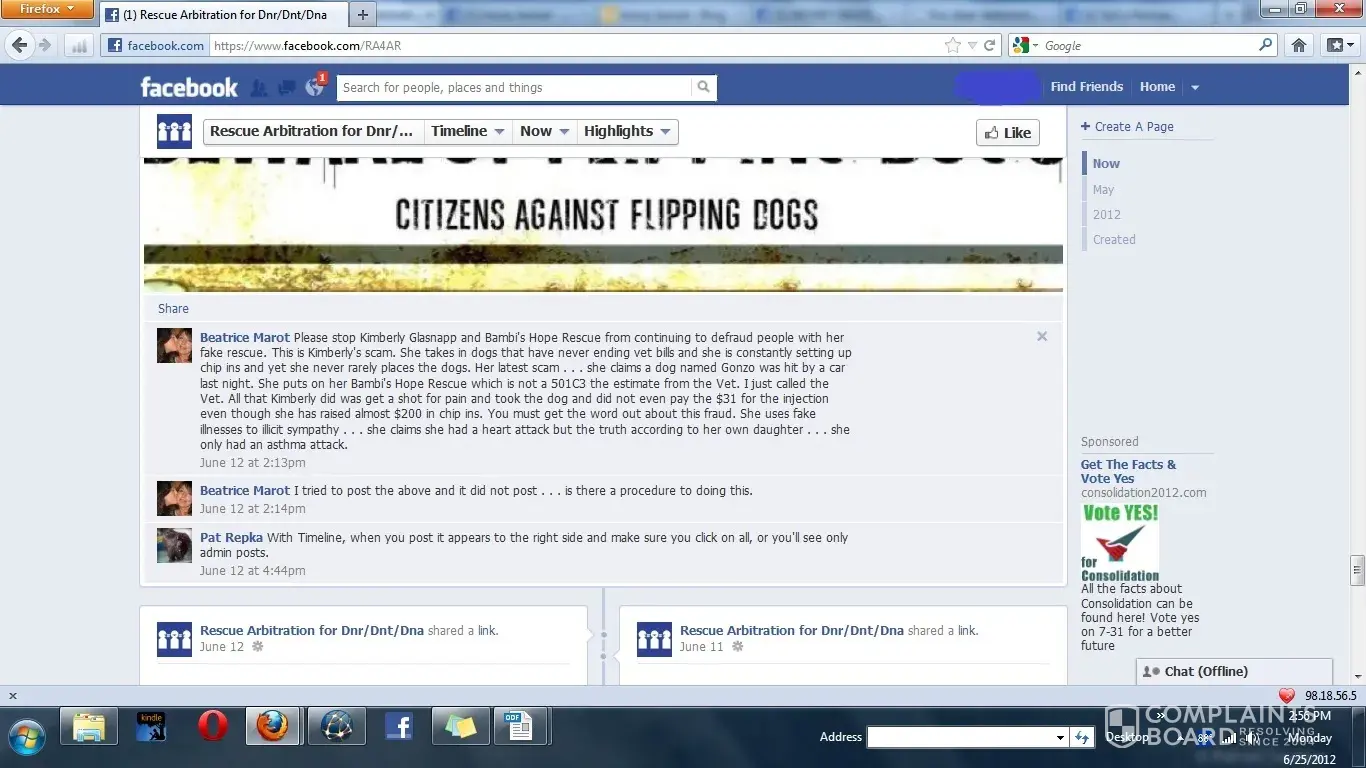 A woman named Kimberly Glasnapp who I fostered two dogs for 2012 and when I found out she was an animal rescue fraud raising money through chip-ins to fund her drug habit, she cyberbullied me for years including a word press blog with ridiculous lies. She called Chip Coffey who fed her a lot of personal information about me. She only stopped because she died of a drug overdose in 2018.