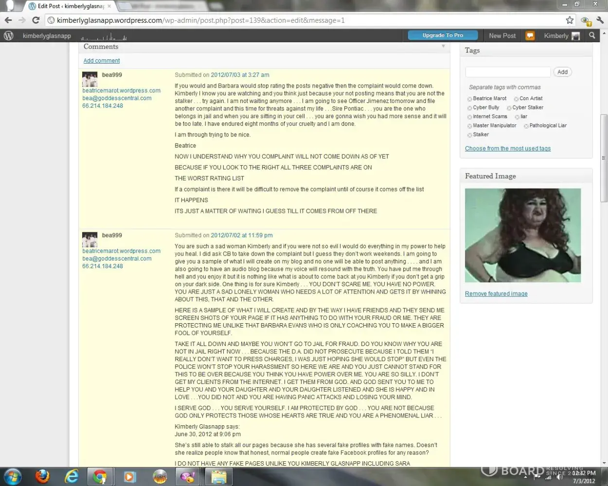 This consumer report is to chronicle proof of Beatrice Marot's more than twenty year history of burning innocent, vulnerable people who think she's a real psychic, to prove she's nothing but a mentally deranged cyber bully and cyber stalker, victimizing any one she has a problem with, and she is constantly having some problem wirth some body. For one thing...