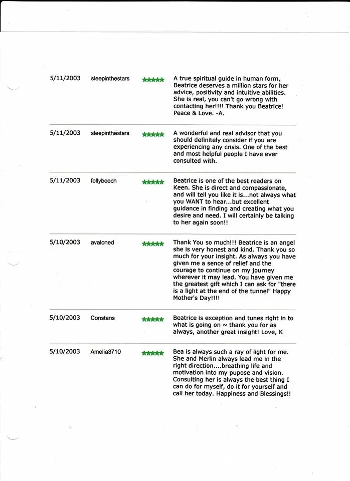 I am Beatrice Marot and I have no idea who this person is but yes if you Google my name there are 21 scam reports about me. Psychic Chip Coffey who I considered a friend, lost his mind when I became the number one psychic on Keen.com, is responsible for most of it.