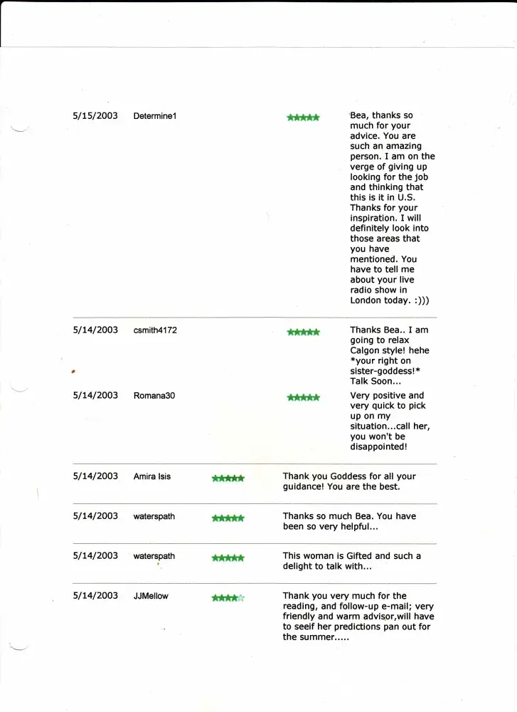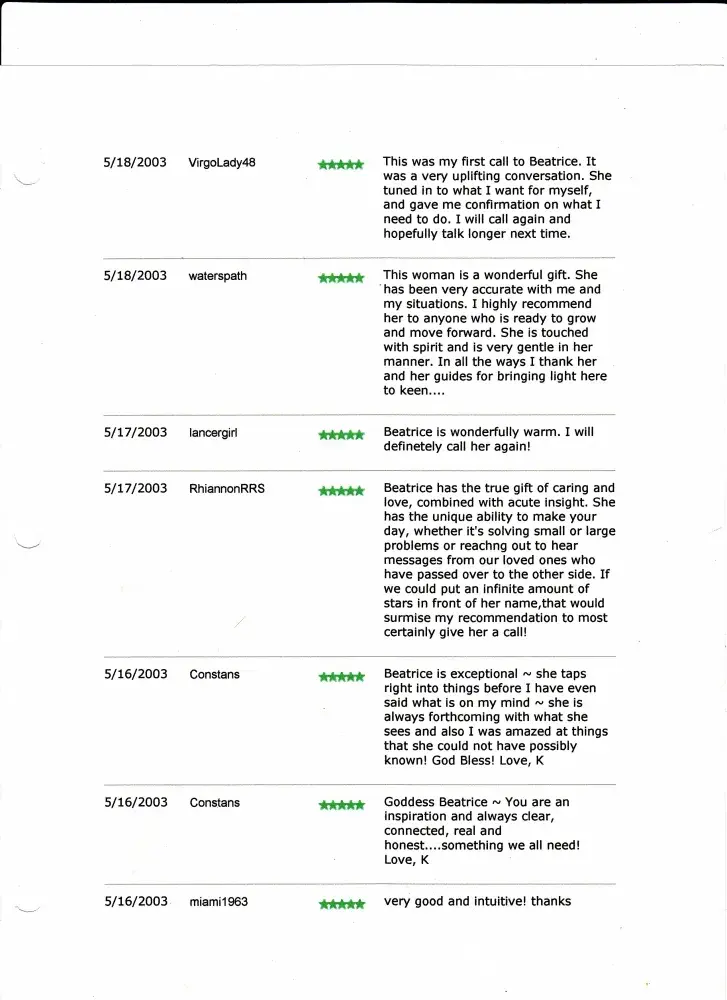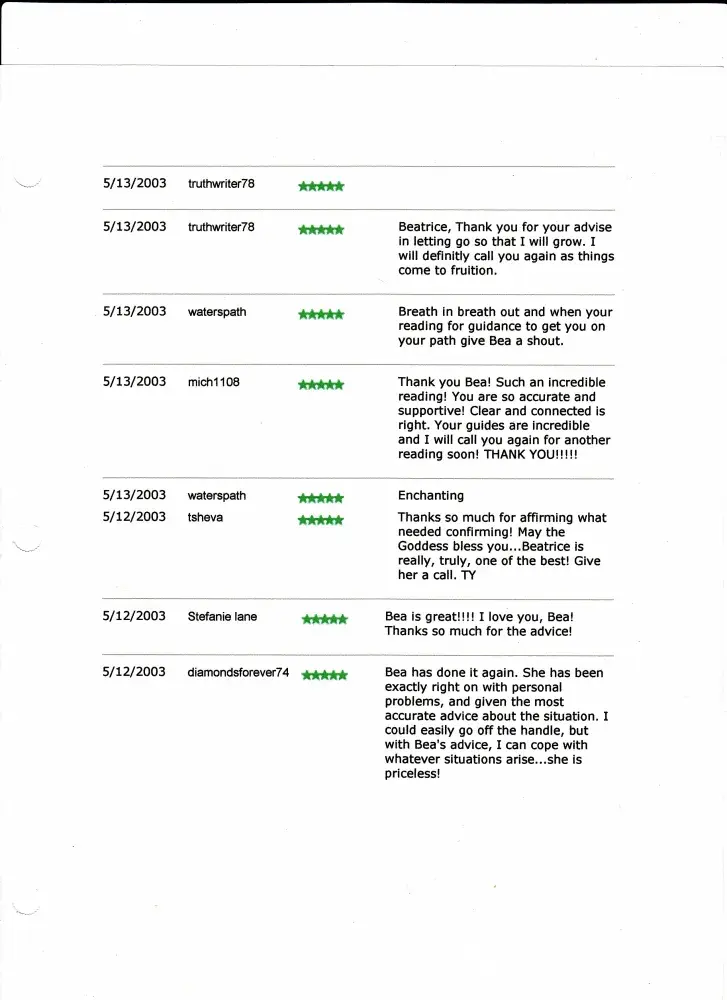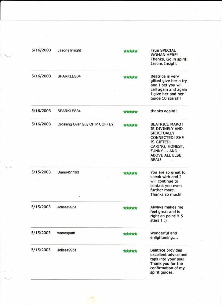 This consumer report is to chronicle proof of Beatrice Marot's more than twenty year history of burning innocent, vulnerable people who think she's a real psychic, to prove she's nothing but a mentally deranged cyber bully and cyber stalker, victimizing any one she has a problem with, and she is constantly having some problem wirth some body. For one thing, she isn't really psychic. She learned astrology and tarot card reading so she could do two things, con unsuspecting vulnerable people out of there hard earned money and putting herself in a role of authority and thinks nothing of twisting the truth and using anything you do or say against anyone who stands up to her, declaring war, and will slander and malign them for YEARS. Beatrice has this exact same pattern with every person she has a problem with: She posts publicly anything from petty insults to outrageous lies, and files online consumer complaints about the ones who have businesses slandering them while sending them and their associates harassing, slanderous emails and when they respond or post publicly to defend themselves against the things she's saying about them, she points at that and calls that proof they are actually stalking her. What she is doing is stalking but she's so deeply disturbed I'm not sure she even realizes how crazy it is that she would really think anyone would believe her if they had all the evidence in front of them.