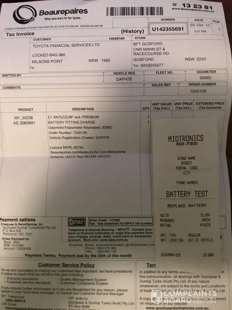 When we arrived at Gosford Beaurepairs at 4:40PM Rommel the assistand Manager was outside talking to another worker. When I got out the car I could immediately feel a bad vibe. I showed Rommel the Invoice of the battery that they have supplied and the battery test showing the battery was faulty( supplied by the NRMA Ranger) After explaining that I was send by Peter from Wyong Rommel said that there is nobody to change the battery and that the mechanic is not there at the moment. I suggested that I will take out the battery and install the new one. Rommel then said that they need to test the battery first but would also not be able to do that because the mechanic is not there. I showed him the print out that the NRMA person gave me again but he just said he cant help. Rommel got very aggressive towards me and my wife and said that he is not able to do anything. Rommel also said that we don't pay for the battery but Toyota fleet? He also said that what do we expect it is 4h40Pm?
