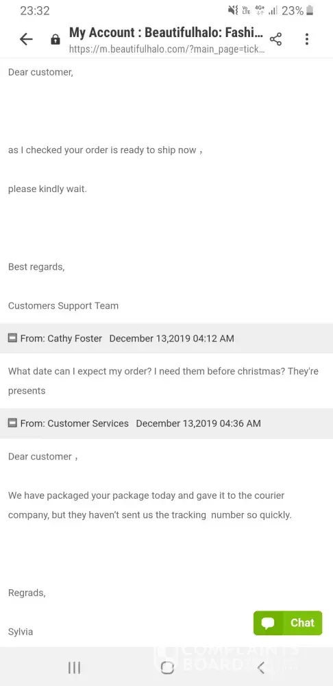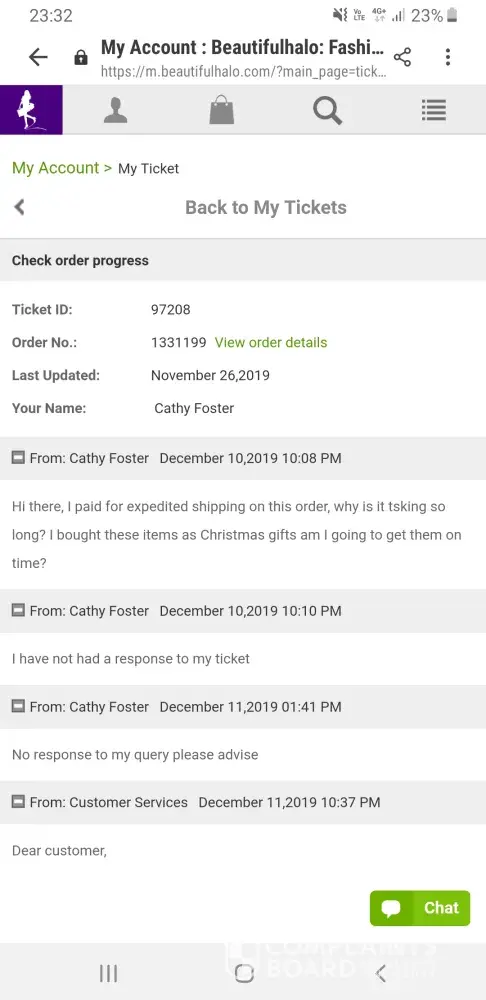 I have placed several requests for updates and nothing changes. The order is listed as "pending" with a? Under orders - beautiful halo. When I have created a chat of inquiry, I am told to inform "support" at beautiful halo.