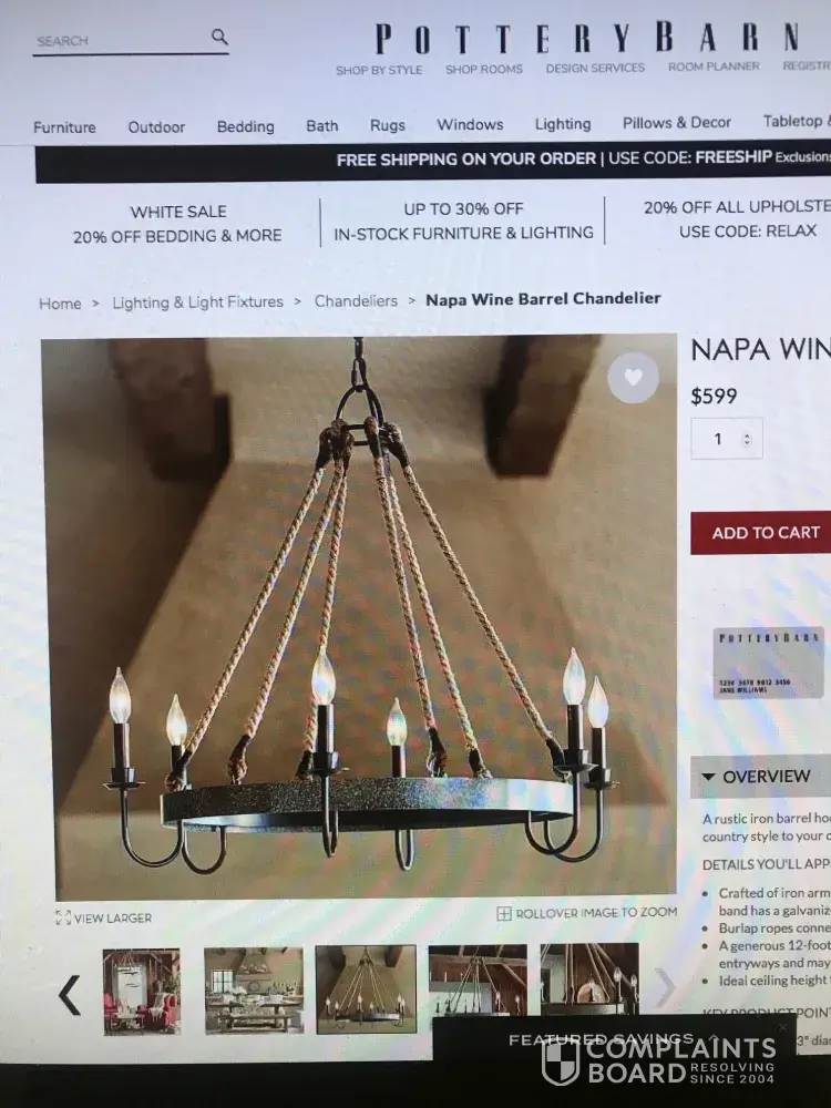 I ordered a chandelier from this company, because they were selling the exact chandelier that I saw on the pottery barn website for a fraction of the cost. Same picture. I figured they sold seconds, and that was why it was so cheap. But the chandelier that arrived was just a cheap knockoff of the one I wanted. The band around the chandelier was just a tube, not a wine-barrel style rustic band. The rope was finished off with duct tape, not wrapped neatly in wire. The chain was less than 2 feet long and was so small that it looked funny holding this big chandelier. One of the lighting arms was bent inward. They posted a return policy on their website, which I checked before ordering the chandelier. They barely respond to emails, and it is obvious that the customer service reps are not fluent in english so communication is difficult. They didn't accept the pictures I sent them and when I resent them in a different format they didn't respond at all.