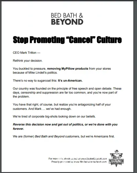 You hate cancel culture and you will show that hate by cancelling Bed Bath and Beyond? That too is a political move.