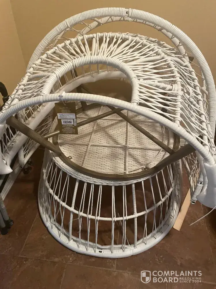 The transcript from my previous request states it would take 3-5 days to receive the order. It's been almost 2 weeks. I asked for a rush on the order as this is my second request for hardware. The 2 chairs were delivered within 3 days of me ordering them. Photos of Egg chair 1 & 2 were provided. One is assembled the other did not have hardware to assemble.