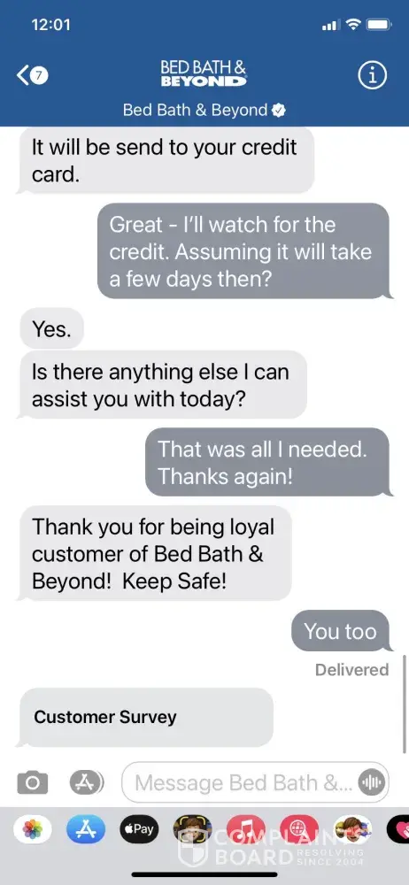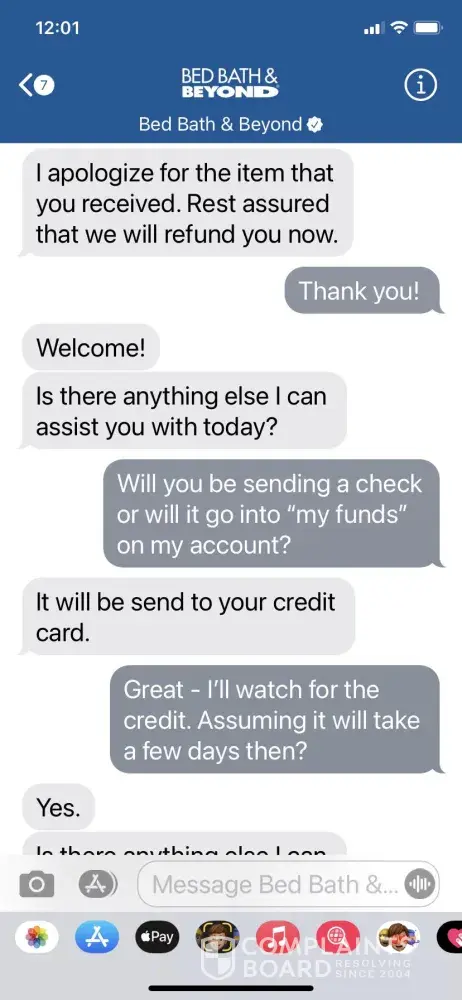 After waiting 3 weeks for the refund, I contacted BB&B customer service and was told to wait another week. I contacted BB&B again on 2/6 for another status and after explaining the situation again, I was told the refund would be processed right away and a credit would be applied to my credit card within 2-3 days. Attached are copies of that chat history.