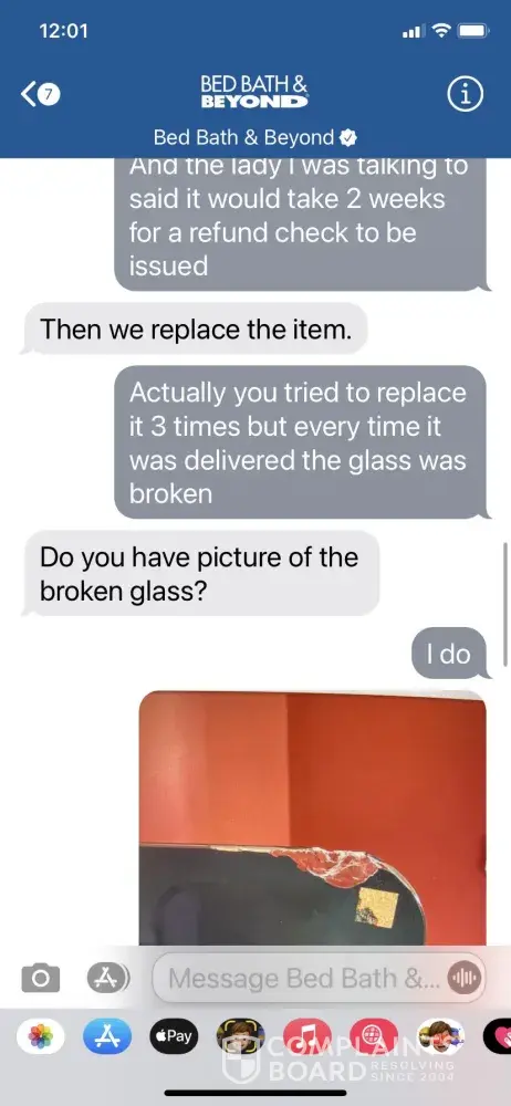 On 1/9/21, the 3rd replacement desk arrived and again was broken. I contacted BB&B and was offered a 4th replacement desk. At this point, I no longer wanted the desk - Xmas was over and we decided we would look elsewhere to purchase one. BB&B requested a picture of the damaged desk in order to process a refund of the original purchase. I was told the refund would take approx 2 weeks. I provided a picture (attaching the same) and was provided with another return label to return the damaged item. Tracking #[protected]. The Fed Ex website confirms BB&B accepted delivery of this item on 1/18/21.