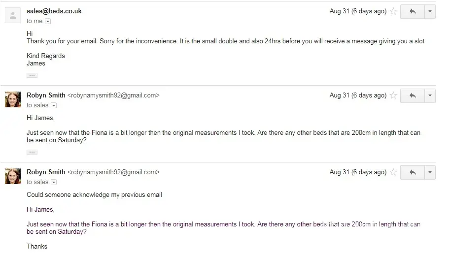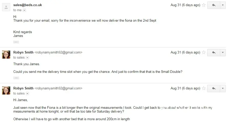 At this point I was offered 10 pounds for the inconvenience and to change the bed order so that I would be able to receive delivery sooner. I agreed to this and gave them a list of the beds that I would consider taking.