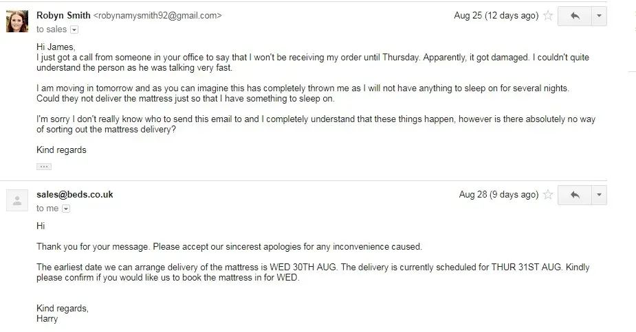 I would like to complain about the service I have received from beds.co.uk regarding the handing of my bed frame and mattress. I ordered both of these on the 23rd August and called to specify that I cannot receive the items until the 11th Aug or after as the 11th is the date I will be moving into the property. The lady on the phone assured me that I will not receive the bed until after move in date and I will be contacted to arrange a suitable delivery date.