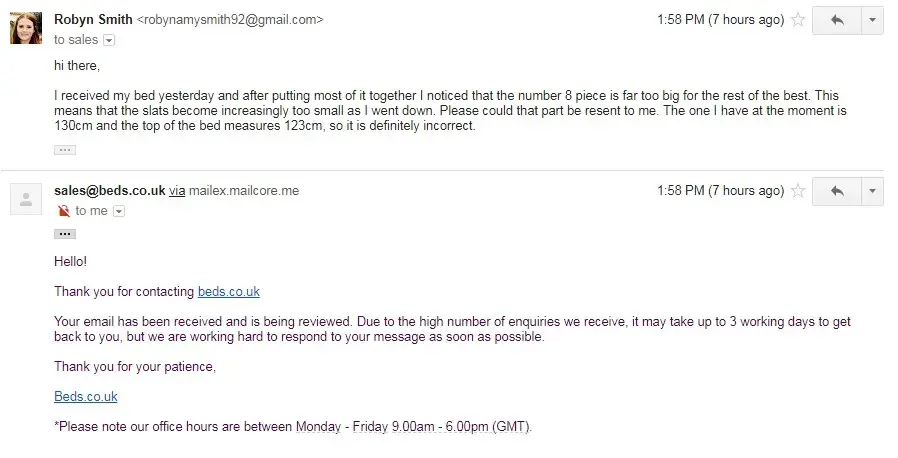 3. It took a week for beds.co.uk to bother responding and scheduling a replacement (unbelievably unresponsive)