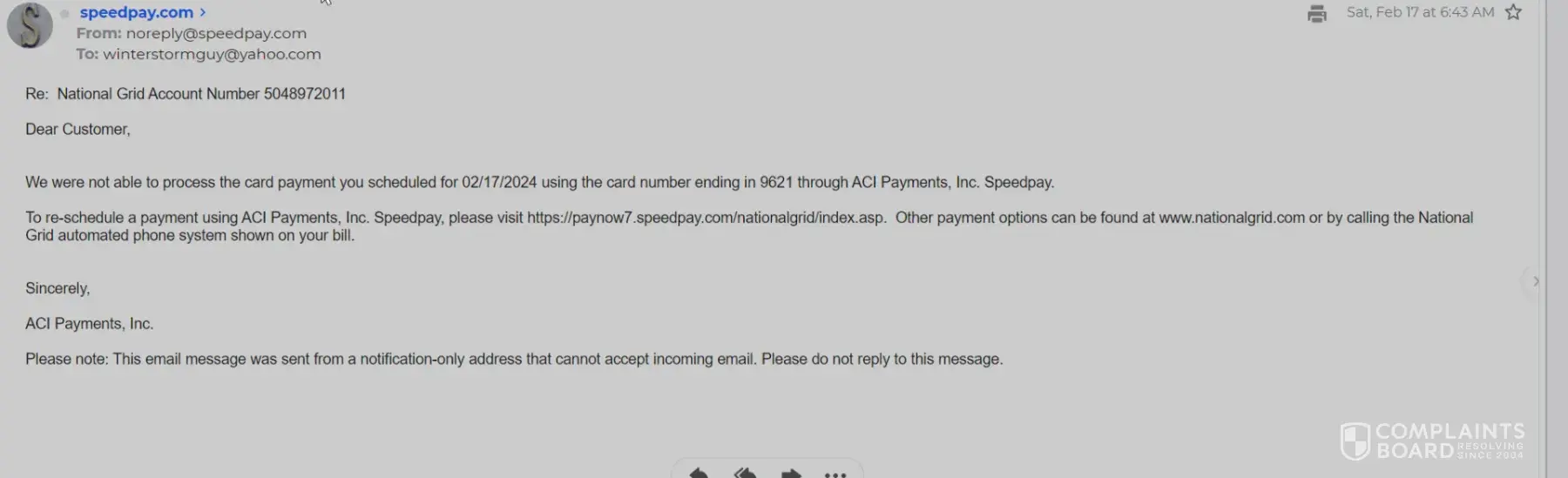 We were not able to process the card payment you scheduled for 02/17/2024 using the card number ending in 9621 through ACI Payments, Inc. Speedpay.