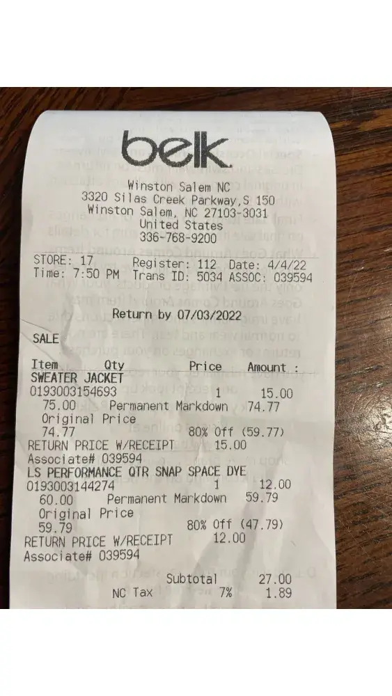 I am writing because of a very unpleasant experience with a Belk employee today. I will attach the receipt: Store: 17 Register: 112 Date: 4/4/22 Time: 7:50 PM Trans ID: 5034 Assoc: 039594.
