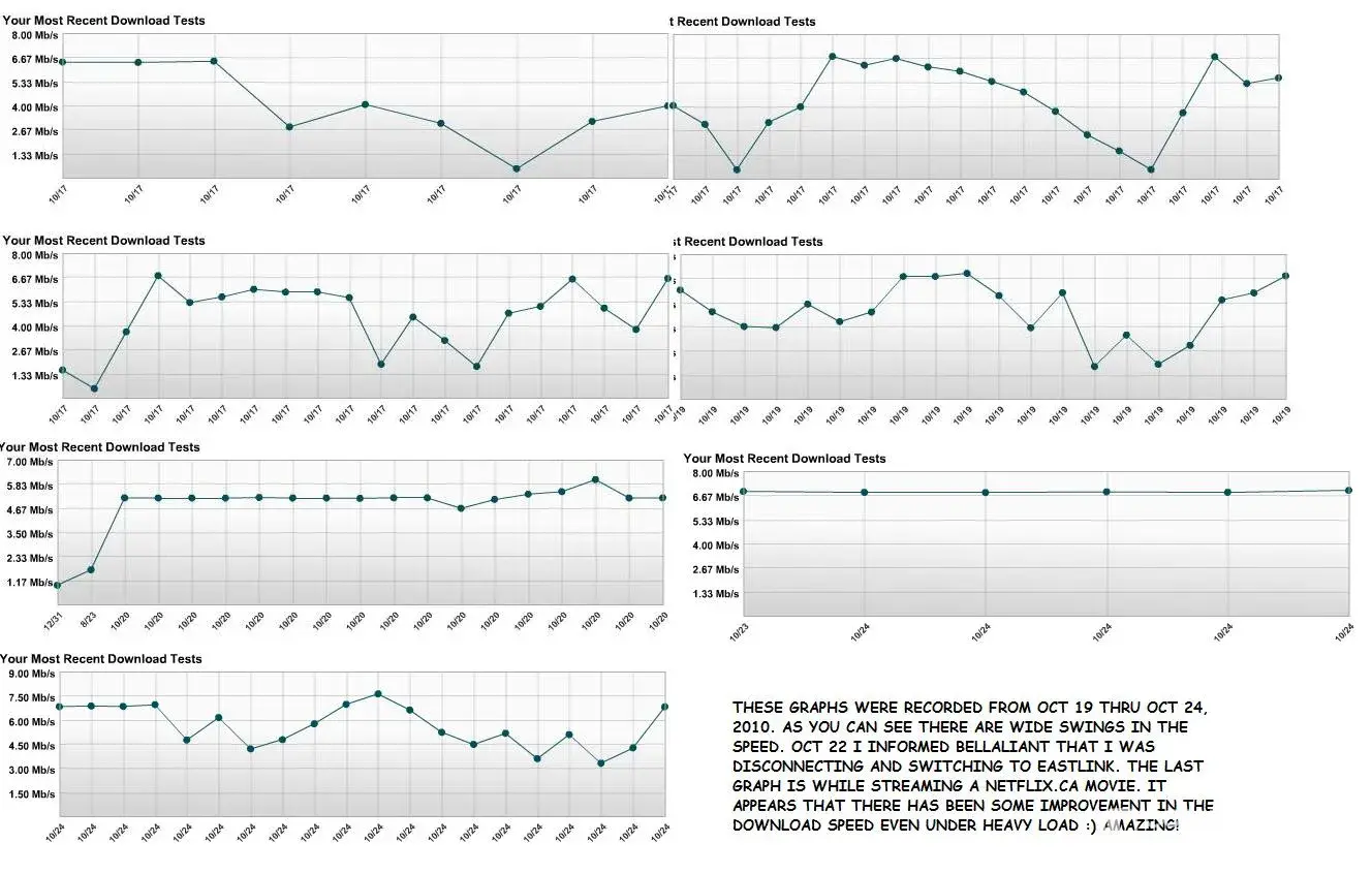 I am tired of complaining to Bellaliant about my Internet speed dropping and stalling my downloads to a complete stand still. After sever techs and complaints and having a band aid put on the problem; I have finally made the decision to switch to Eastlink. I just hope that their Internet, Phone and TV service is better than Bellaliant. Bell finally admitted in an email that the lines are monitored automatically and if they become stressed or overloaded the speed is dropped to spread the service and load. The company flatly denied this on several occassions in the past. Now with the introduction of Netflix.ca into Canada, Bellaliant and Rogers have openly said that they would be reducing the amount of time and speed of the downloads in order to offer at addional cost a service that will stream the movies. I am already paying $55 a month for a service that should be sufficient to stream the broadband movies. If Eastlink does not offer any better service then I will be going to Satelite. I have read several complaints on the site about Eastlink service and rude customer support reps. But, as a consumer, I have the power and the choice to disconnect and move on. Attached is a pic of some graphs taken of the Bellaliant download speeds that shows the incredible dips in the speed. Surprisingly though since Friday, Oct 22, when I called Bellaliant and told them I was disconnecting from their service and going to Eastlink, the speed and streaming have improved even when running a movie from Netflix.ca. Amazing! But I am still switching to Eastlink in hopes of getting better download speeds that will be more steady and consistent. The package I had with Bellaliant was for Phone and Internet at 7mbs download at a cost of $115 a month by the time the little extra charges and taxes were added on. With Eastlink I am getting a bundle for $107 for one year with free phone service and then increasing to $126 at the end of the year. And that is for TV, Interent with up to 15mbs, double what Bellaliant offered for close to the same cost, plus phone service which is free for the first year. Time will tell as to which company offers the best service for almost the same dollar value. Customer service I can do something about. I record all of my communications and if I get a rude service rep, there will be a complaint filed with a transcript and a voice recording. As well, I can request to speak to another rep or a supervisor. These are my rights as a consumer. I don't have to put up with inferior service or impolite service reps. See the attached photo of the graphs for a speed download comparison. The dips were so low that the computer came to a complete stop.