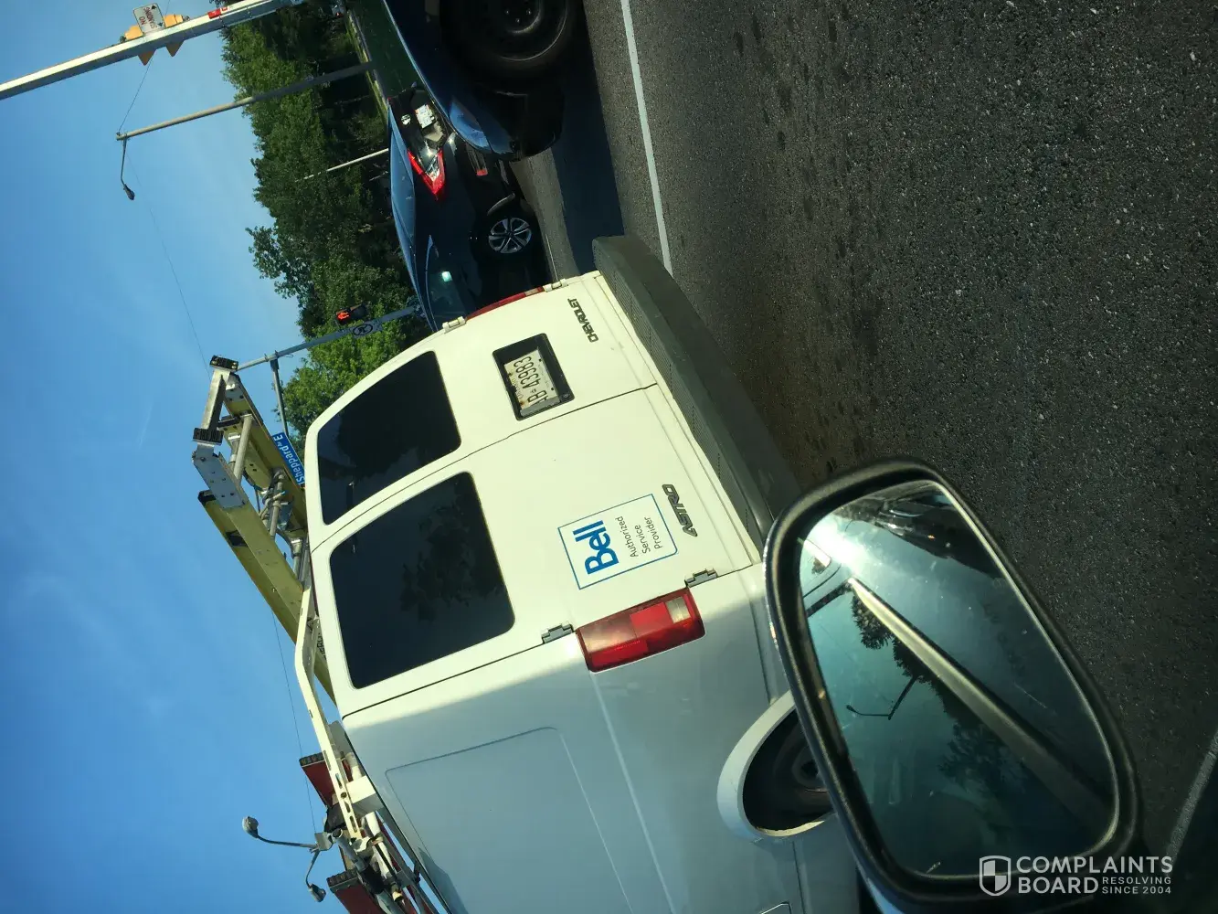 A Bell service van was at lights of Murison Blvd and Sheppard Ave at approximately 7:25 ok July 30, 2018. The light changed to green however the driver didn't proceed until my husband tapped on the horn. The driver still did not move, then moved slowly while rolling his window down and saying "what the [censored] is your problem?" My husband said to him get off your texting and drive. As we approached the lights at Neilson Rd and Sheppard Ave, we were in turn lane and he was to the right of us at the res light. He rolled his window down again but I told by husband to ignore him. However he then says "[censored] you and your stupid wife". And so we snapped a picture of his plates. AB 43983.