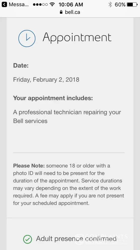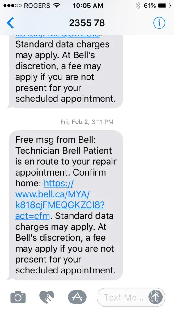 On February 2, 2018 a professional technician from Bell was assigned to repair my residential cable issues between 1-5 PM. Bell sent a message informing me of that the technician was on his way via text message, a photo and a name of the technician was also provided. I thought this was a very nice touch and reassuring security measure.