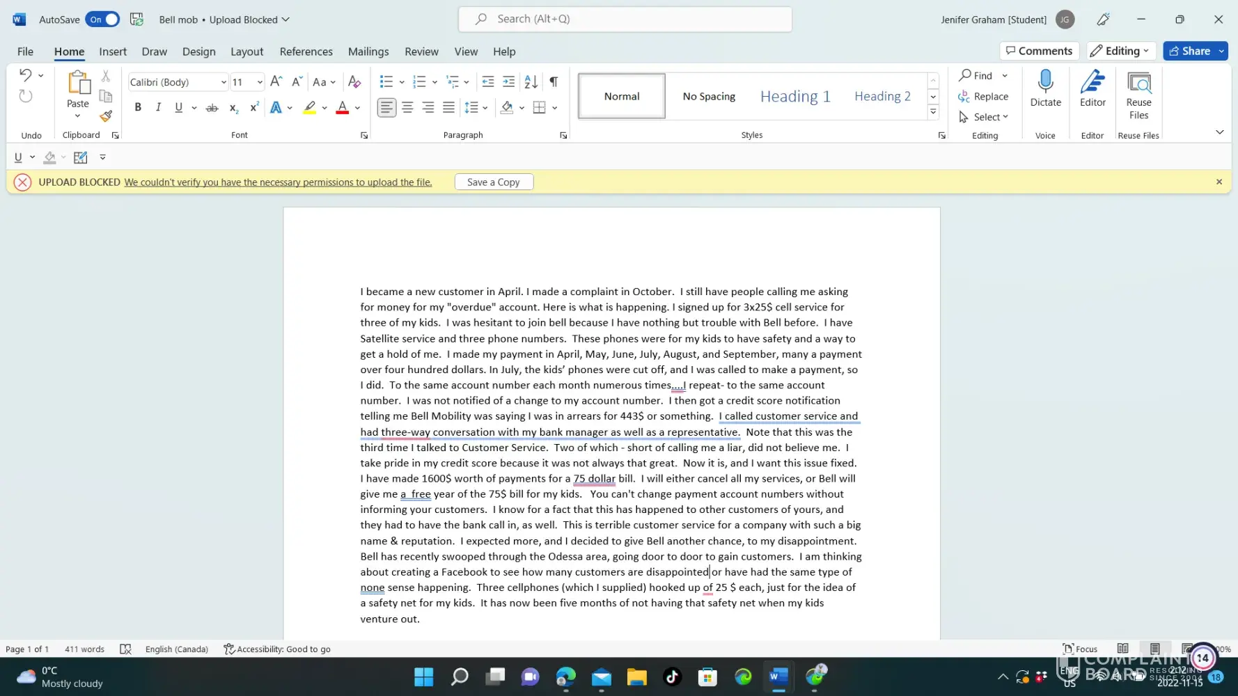 Desired outcome: I want a genuine apology consisting of Bell taking ownership of their mistake compensation credit one bill account reflecting serious nature of situationinformation regarding account changes that bell may have made now