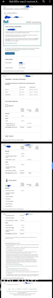 On the 25th I called to deal with continuing issues involving us being improperly billed with Bell Mobility and while speaking to the rep asked what was occuring with this supposed deal. In checking she noted that there was something listed in file but that the email had failed to send and the issue was the fact that it wasn't sent to the email listed on file so she then sent the email and corrected the email it was to send to and so to expect it to send twice to me. It did send twice and in quickly reviewing it at that moment while dealing with the mobility issues seen it would not occur until the 8th of September so could wait a couple days, as my wife was at work and would be the day following, to still review with my wife to make sure it was what we expected.