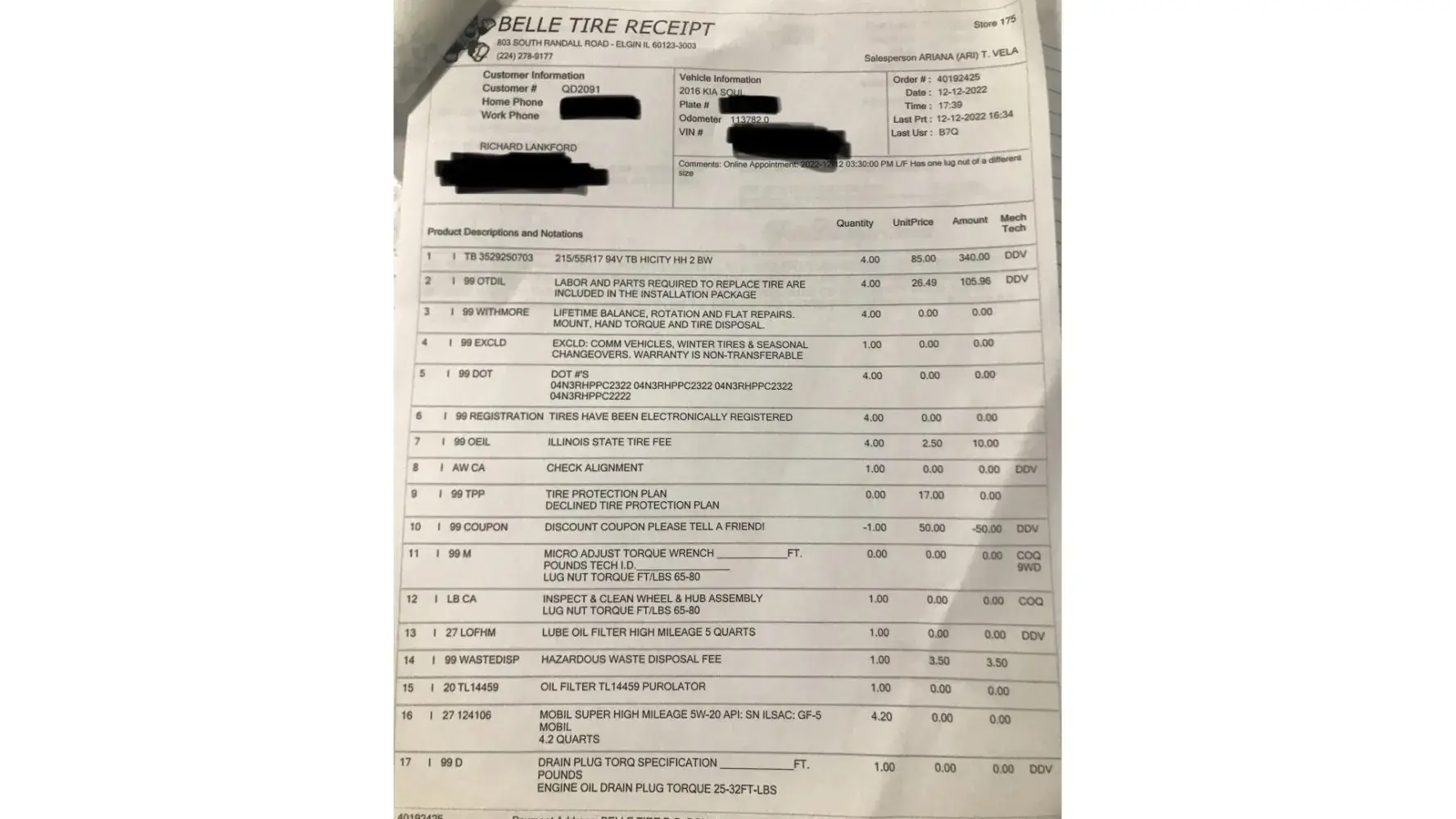 On the evening of 12/12/2022 I visited Belle Tire in Elgin, Illinois after work for a 15:30 appointment. I set it up for a new set of tires and since I was there already I figured why not get an oil change too. I was told it would be about 2 hours so I went next door to Meijer department store and did some Christmas shopping. I returned to the store about...