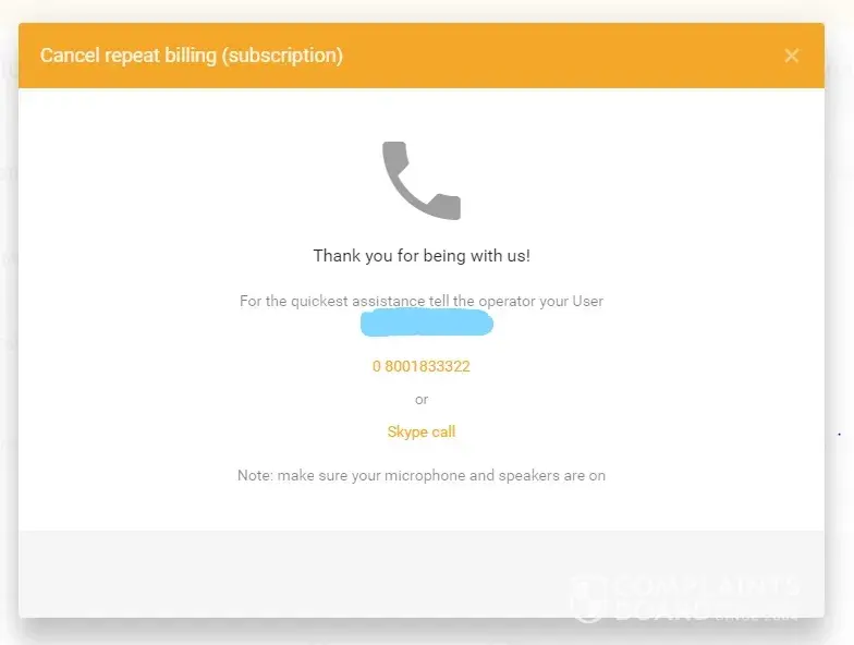 I follow the instructions to cancel my membership but I am asked to call customer support in order to do so. I call them via Skype and it just says "no answer" every time. I sent an email detailing this problem but was asked to do the same over again, instead of just cancelling right there and then...