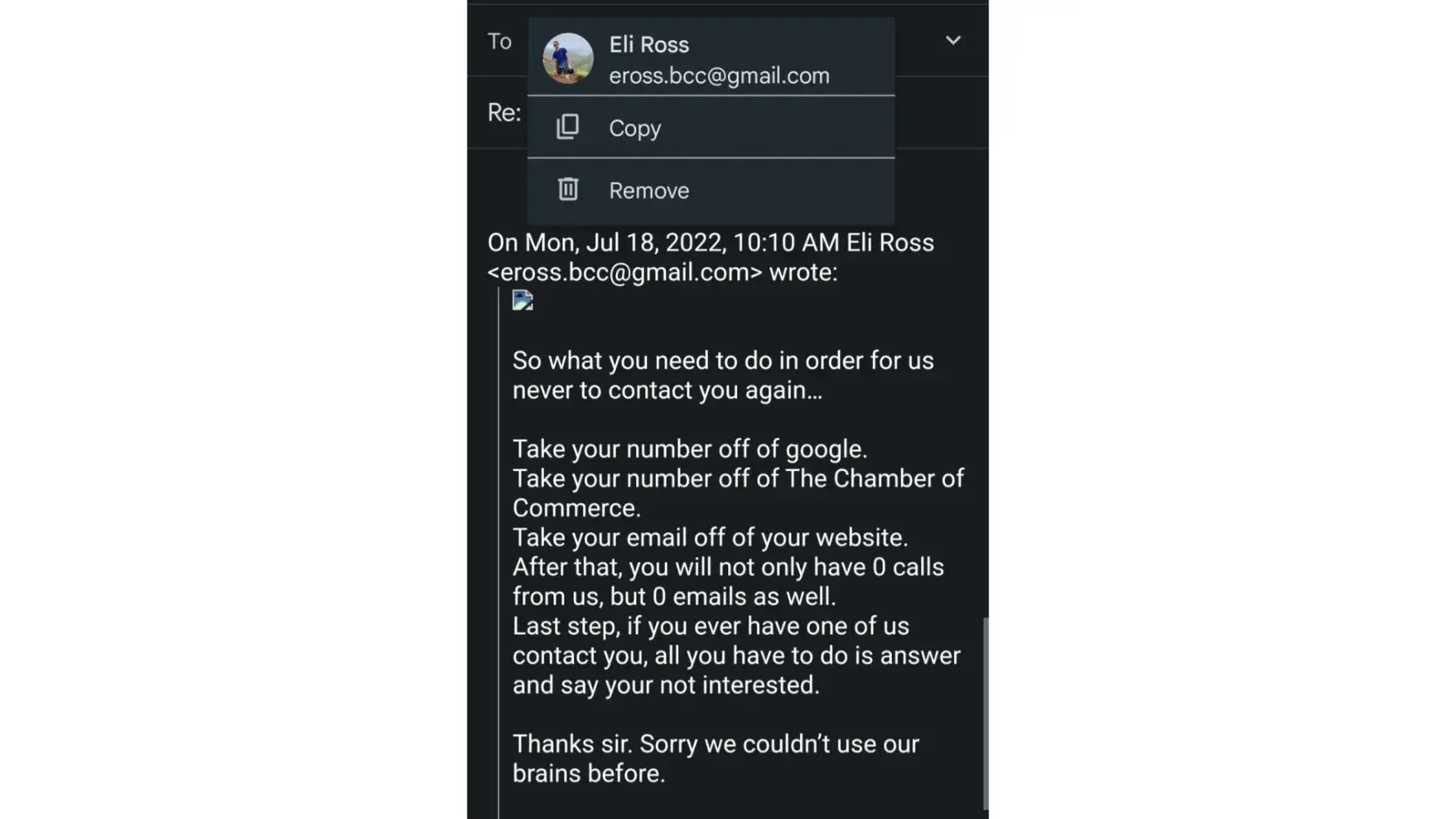 "Please do NOT contact us ever again. Your email although well written and detailed was very unprofessional."