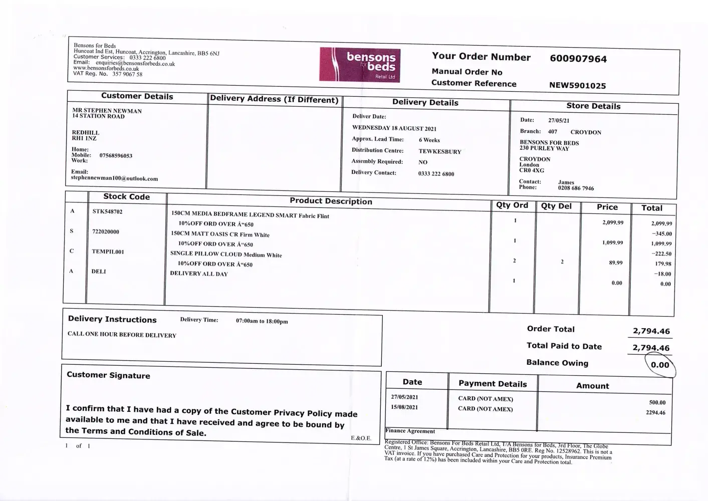 I am writing to complain about an issue regarding In-store shopping with Bensons for Beds. I have already raised the issue with this organisation and it has not been resolved to my satisfaction in the several months since I first contacted them. I have now exhausted their complaints procedure.