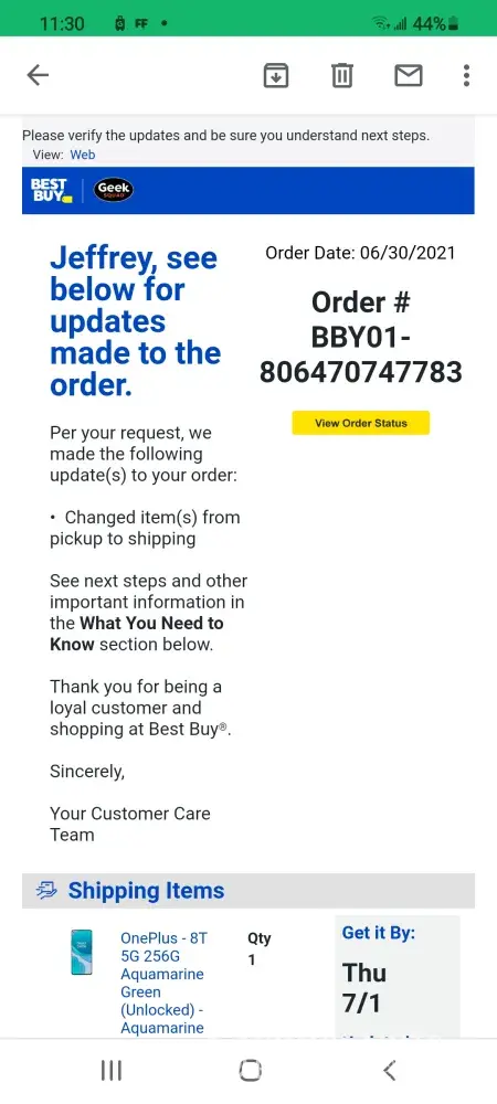 Best buy San Francisco, ordered a OnePlus 8t for $580 online that said it would be available for pickup today, suddenly I got an email saying "at my request the status of the order has been changed" and now the phone is being delivered to an address I don't live at anymore, and I can't make changes to the order from the website when I called to talk to...