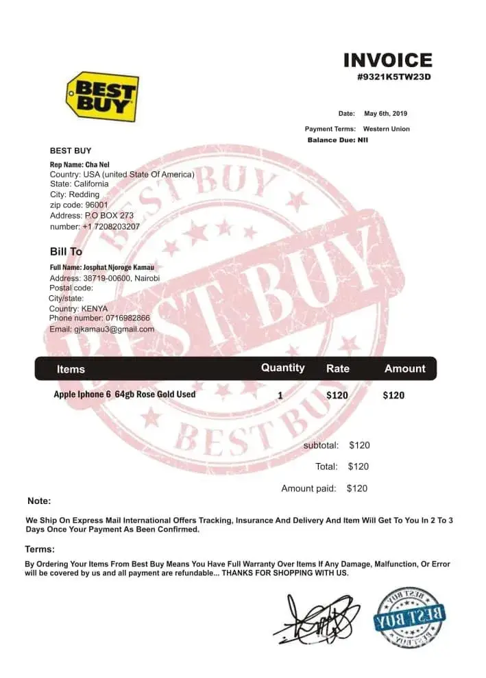 I ordered I phone 6, , , 64 gb where I was given an invoice of 120$ which I paid