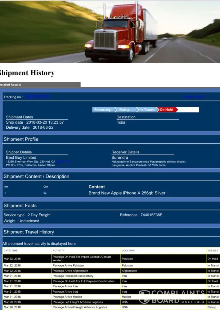Hello sir am surendra from Andhra Pradesh India. We booked iPhone X with a payment of 20k Indian money. This is tracking id [protected] they have given and said with in 2 days it will be deliver at your doorstep but yet I didn't get it, please help us. Courier name:freadvlogs Shipper Details: Best Buy Limited 15350 Sherman Way, Ste. 250 Nel, CA [protected] PO Box 7735, California, United States