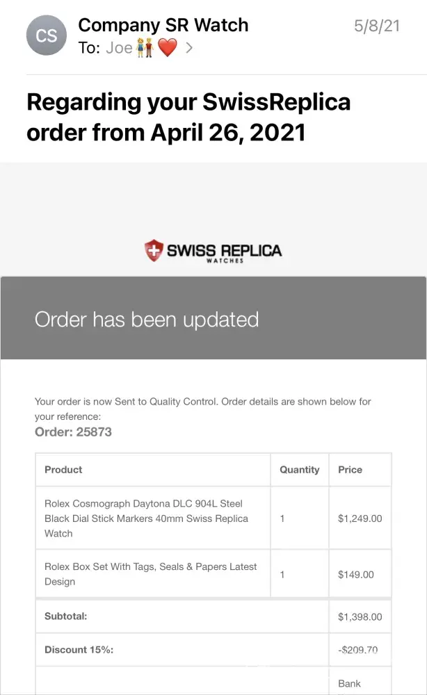 November 28th, 2021. Sent this “company†$1000 via western Union for a replica Rolex Yactmaster with box and card. Never received the product and won’t respond to the multiple emails I’ve sent when asked where it is or what the status is. I emailed them through another email, acting like I was an interested buyer and they responded immediately. So now I know for sure they’re not responding to my order.
