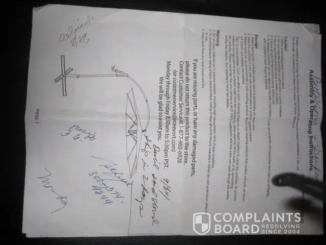 I purchased a Better Homes and Gardens offset umbrella from Walgrens which was delivered 8/28/2015. While setting it up we discovered the pole was bent the wrong way, forward rather than backward, causing it to be too low to the ground. This was apparently a manufacturing defect. I am 5'6" and could not walk under it. I called customer service and spoke to a representative named Daniel and sent him e-mail pictures of the umbrella. He said they would send a replacement pole. 9/30/2015 I called Daniel again as I had not received the pole. He said there was a delay but the pole would ship in 2 days. 10/30/2015 still no pole. I called and got a different chap as Daniel was not at work. This chap said they were on back order. Called 11/9/2015 and spoke to Daniel. He said I should return it to Walgrens. Why didn't he tell me that 2 1/2 months ago? I relied on the Better Homes and Gardens instructions and customer service representative Daniel. How am I suppose to return an item with no box? And by the way...summer is over.