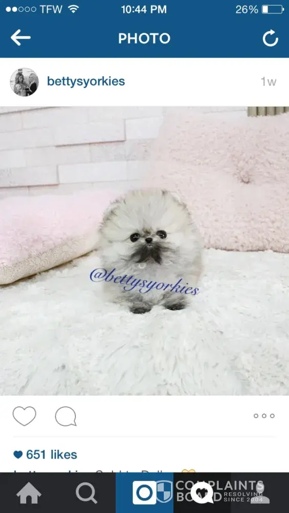 A follow-up to my previous comments: Let me recap - Things went well, communication was great. Then I wired them money to their bank. I was wary, believe me. When payment went through, That is when things went sour. I did not hear anything from them for two weeks. I followed-up with multiples texts and calls. At one point I think he (her husband, perhaps) was annoyed at my calls. He or her told me via text they were away for two weeks. Nice of them to let me know I was not getting my puppy right away. Probably three weeks after the transaction I received my dog (not a puppy), a week after I posted my experience. I have nothing to gain from this, I am simply being honest about what I have experienced buying a dog from Betty's Yorkie's. After all of the non-responsive texts and calls, they finally sent me my dog. Before I received the dog, I had asked for pictures several times. They told me they would be sending me one (when they felt like communicating back to me). I never got them and I got tired of hounding, at this point I just wanted my dog. When I saw my dog, he looked nothing like the photo I saw. What they posted was a puppy photo of him. Granted, they did tell me the dog was almost a year old. But they also told me my dog was 4 pounds. The dog was almost 7 pounds. My dream, to get a little 4 pound dog. My reality, well you know...My dog, a black Pekinese, is now the love of my life. No health issues other than his nostrils were too pinched so he had surgery to open them up a bit so he can breathe better. He is very happy right now with two other fur siblings (not purchased through Betty). So if you ask, would I buy another puppy from Betty's Yorkie's, the answer would be hell no. That was a big gamble I am not willing to take again. And the comment from Molly Plays was completely uncalled for. If anything, your comment was harassment. This is an outlet for people to get their experiences out. So if you had a good experience with Betty, GREAT for you! You had a happy ending, some others did not. And the comment about Paris Hilton? Really? She is a millionaire who is well connected with the media, of course she is going to get the VIP treatment from Betty. She hand delivered the puppies to her. She would be screwed if she delivered sick puppies to Paris!