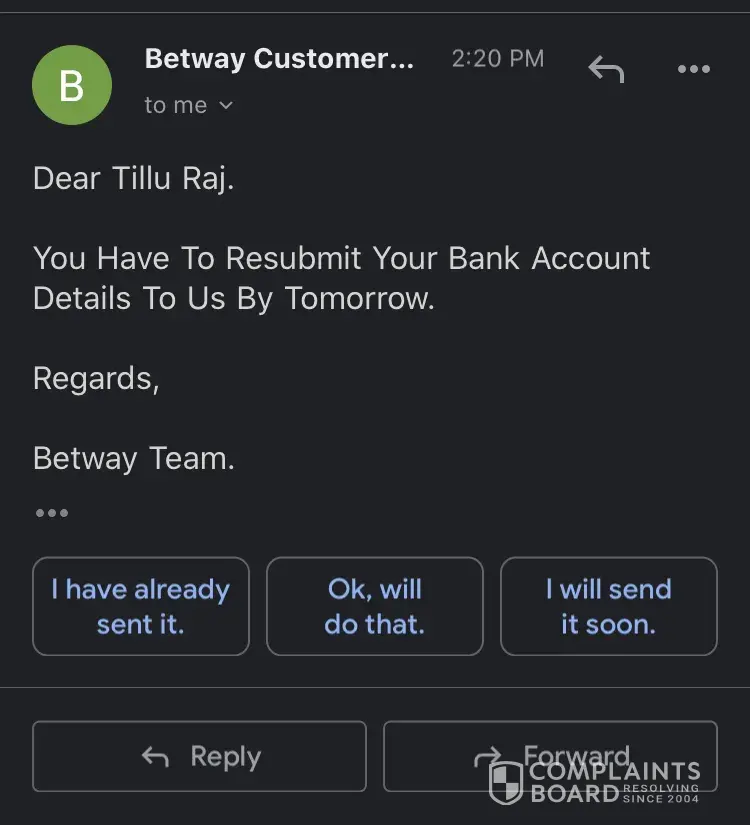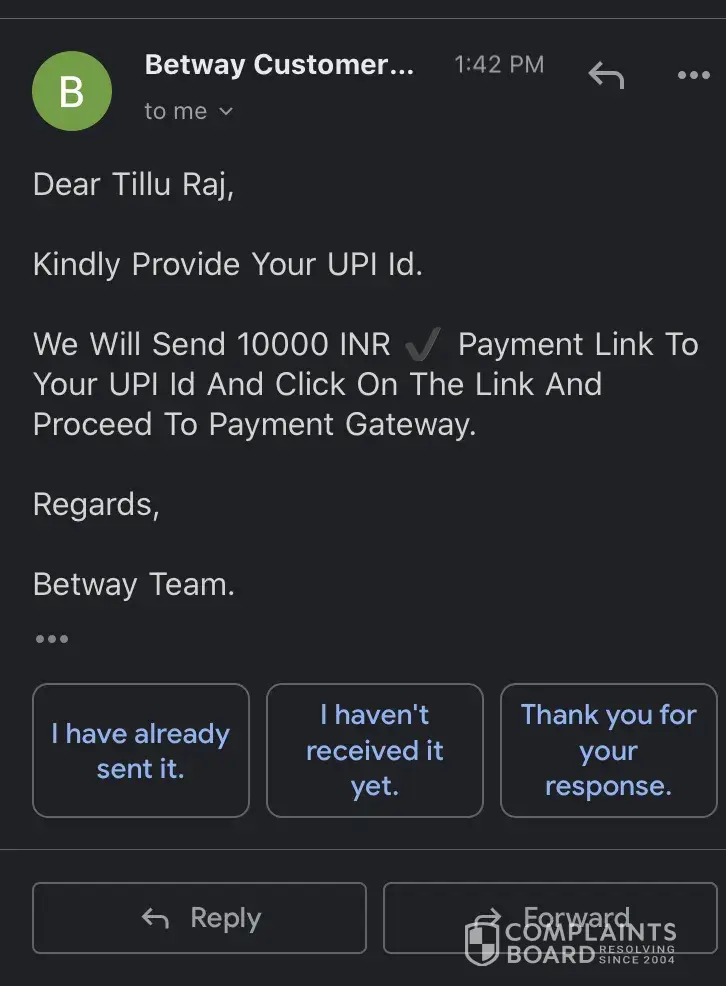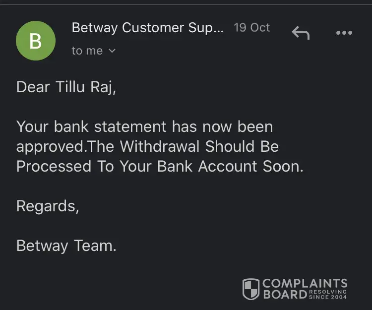 I had made the payment to the betway but my mistake was I made it from my wife's account and later I saw that if there is a name mismatch then amount will be refunded to the original payment account. I sent the screenshot, I sent the bank statement still no response. they keep on asking for the bank statement with the bank logo, full name mentioned. I keep sending and my 4000 Rs. is stuck. is there any way get rid of it? I am sure that I won't use betway for any purpose in the future once i get my money back.