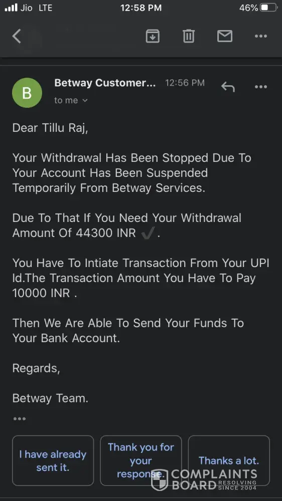 This is unacceptable, and it has caused me a great deal of inconvenience and financial loss. I am now forced to take legal action against Betway for its negligent behavior and failure to fulfill its obligation to credit the deposited amount. This is a clear violation of consumer rights, and I will not hesitate to pursue legal recourse to recover my deposited amount with all proofs and the response I got from the customer support