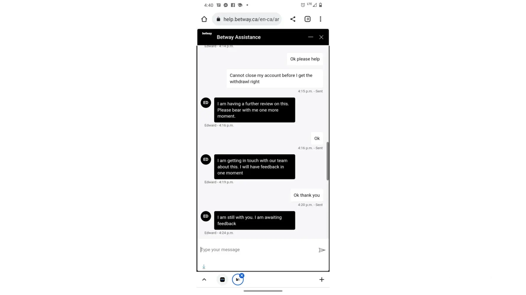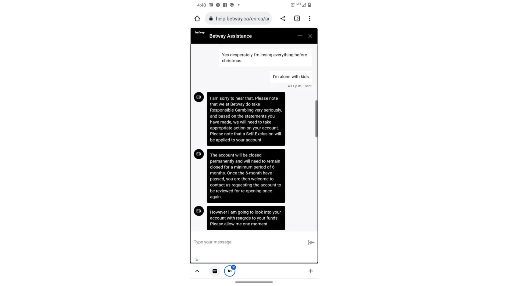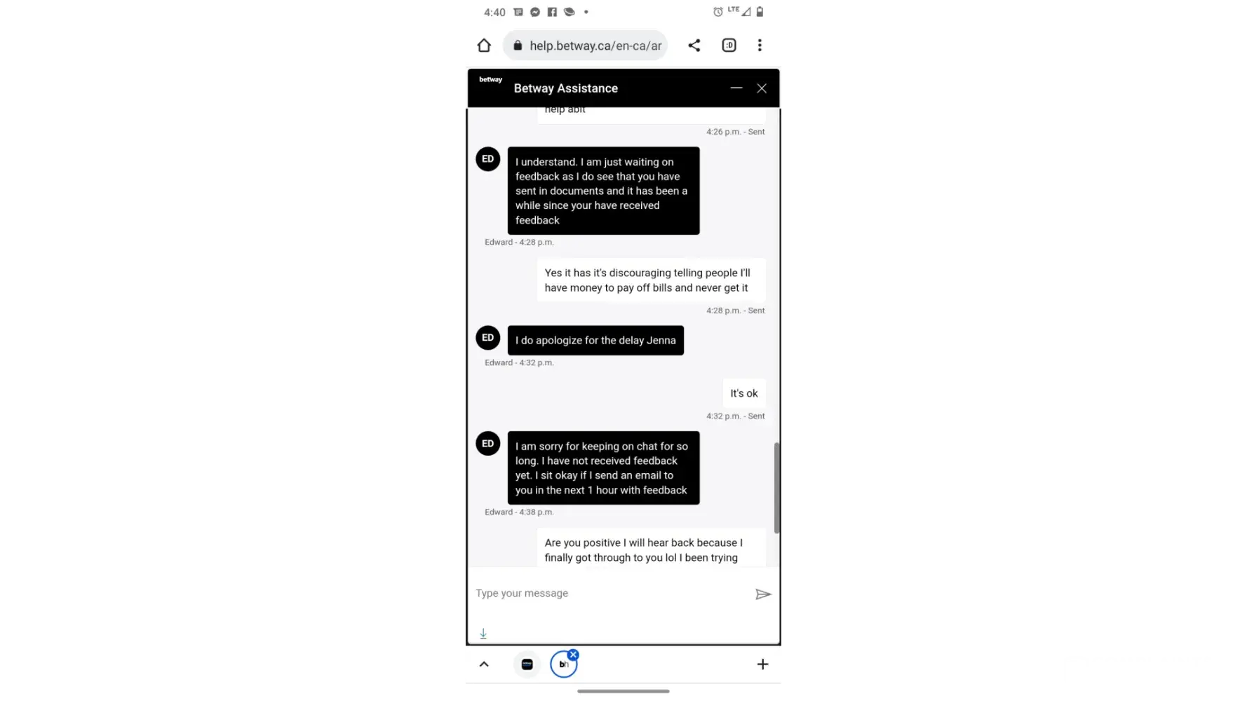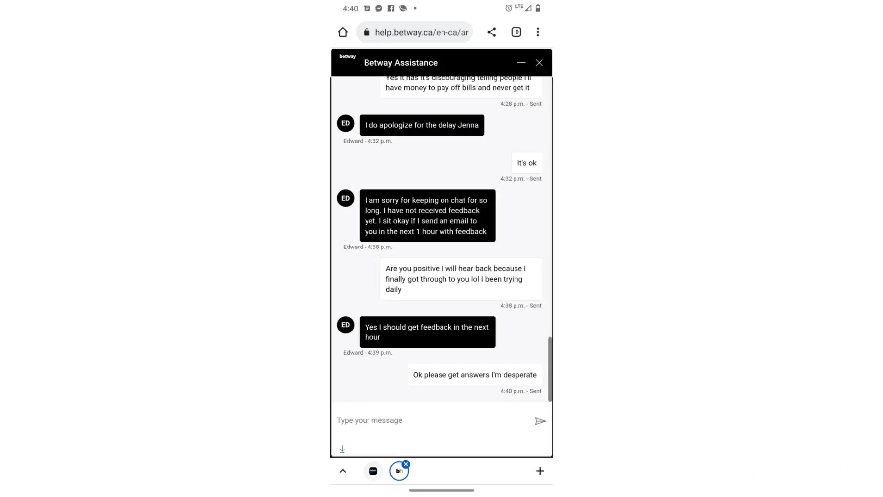 Hello my name is Jenna boltz I have an account with betway and was woundering if you can help me. I spend alot of money at this casino and ended up winning I have been waiting 5 weeks I've sent in multiple documents and no reply to emails. I am a single mom of 4 and desperately needing this cash I'm losing everything before Christmas if I don't end up getting the money that shows paid on my account I may have to send all live chats and proof of sending documents in as I have no other choice I will be homeless. Can someone help me!