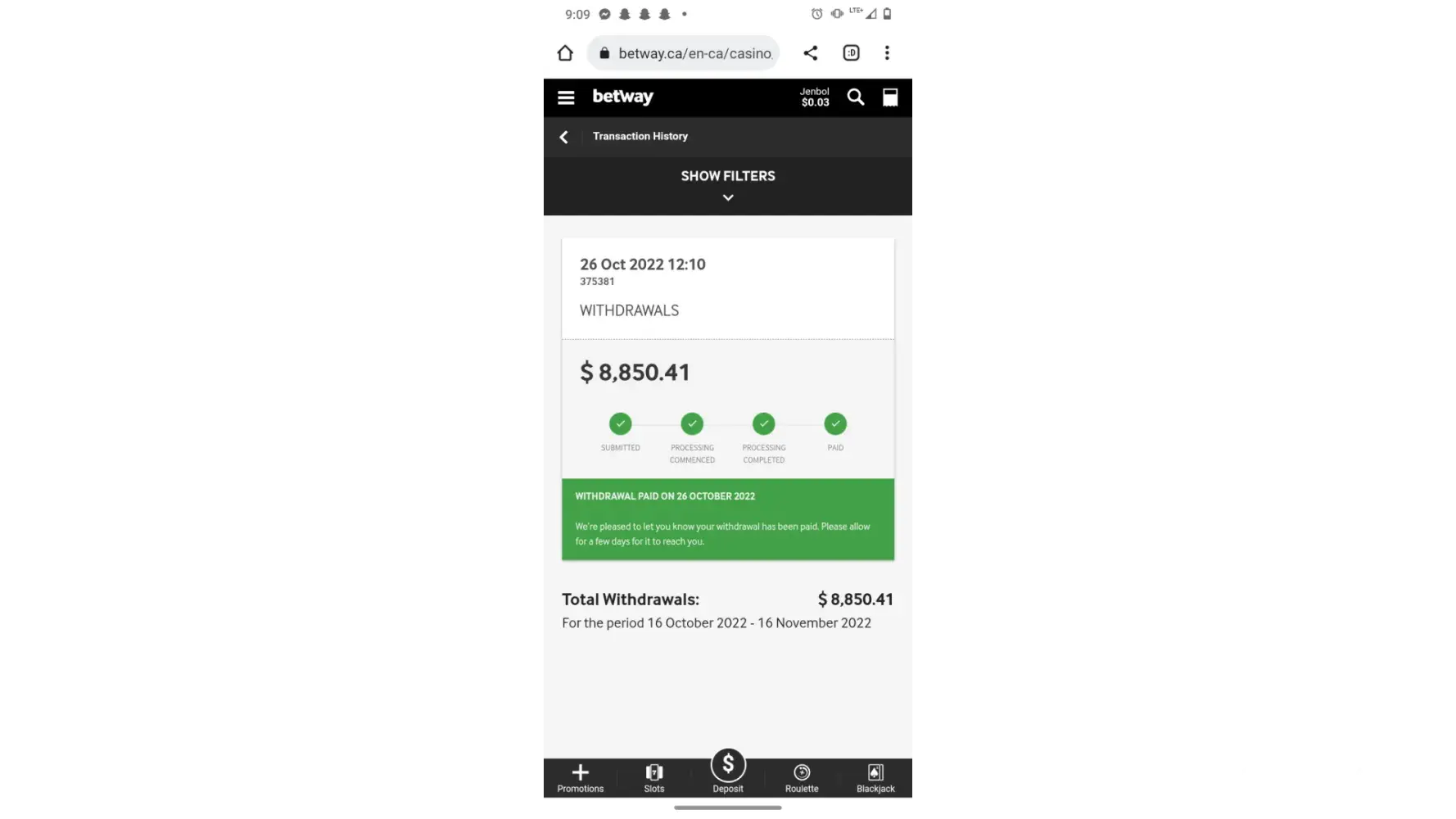 Deposited fund was not updated by betway