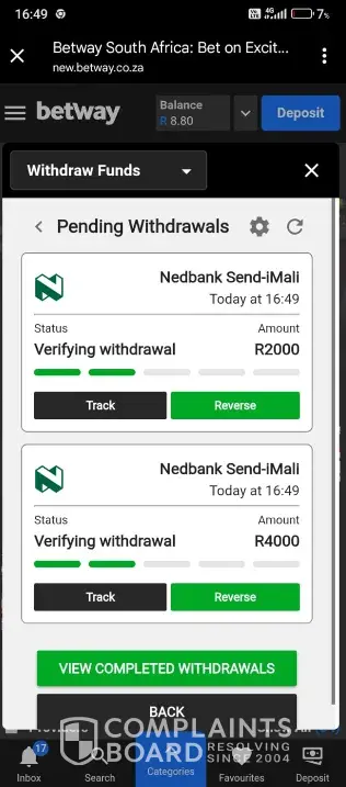 So i checked on betway to try an see what is the problem but all i see is no money because i thought the money couldve reversed because of the problem betway was having.