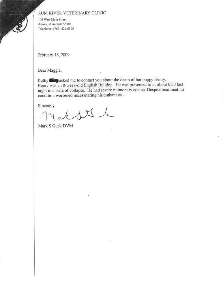 Okay Martin, I totally agree with what you have to say here. My name is Kathy and my friends and family do call me Kat. Why you are saying my identity is not identified is beyond me. What also is beyond me is why you are saying you have been unaware of cause of death. I called you the morning after it happened. I even had my vet office fax a copy of the cause of death to PAWS that same day. Just a FYI too, I work at a Trauma One hospital here in the twin cities and am very familiar with diagnosis. The day Henry got sick I acted immediately I had him to the closest vet within 5 minutes of him getting sick. For goodness sakes I left the house in my PJ's and slippers that is how fast I reacted. Working at a hospital I know that how and when you react is essential. I tried to help Henry I reacted immediately but in the end I just couldn't give him the help he needed. Standing in that emergency room at that vet office I was hoping someone would just pinch me and I would awake from the dream but it was reality. Coming home empty handed was the hardest. We loved Henry and took very good care of him for the two weeks that he was with our family. I would never spend 1400 for a puppy that I would neglect. I am a good mom to my children and was a great mom to my little Henry. We miss him everyday. First thing Monday morning Martin I will have my vet's office fax you a copy of cause of death and I hope you keep your end of the bargain. Or are you going to find some lope hole to jump out of. And for the world I will post that cause of death on this page so that it will prove to the world that this is not some story I just made up yesterday and that I am not the kind of person Martin portrays me to be in his response. I will let you guys know if Beverly Hills Puppies keeps their end of the bargain.