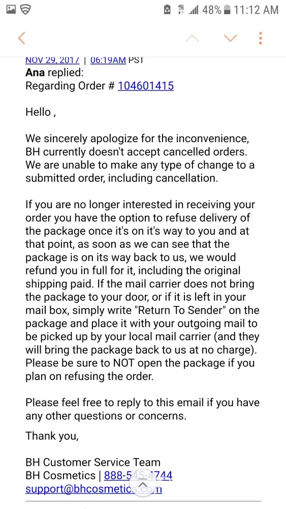 I ordered 2 times in BH cosmetics and they canceled all my order because they said that they can’t provide the stuff because of the third company and I still see all the stuff I want to order still available on website. I tried to email to every mail they have and no one answered me. I’m so disappointed and angry because the way to serve the guests of BH cosmetics.