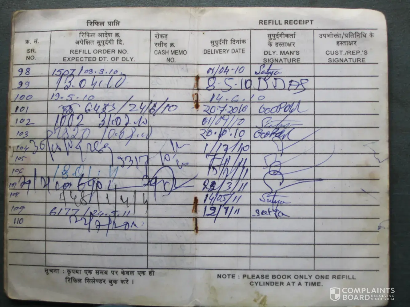 1. Kindly check the record of booking whether really the gas was delivered at my residence and if so there must be some signature or so