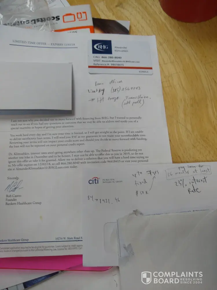 I had received multiple letters from "Bob Castro, founder, Bankers Healthcare Group" claiming to offer me great loan terms and that their process is very fast and straight forward. They claim to have me selected and they offer "special incentives and satisfactory loan terms". Letter keeps talking about "special offer". I called, filled out a short application and process started. They needed more and more info and for me to sign different forms. At one point I told them that I'm done with their incompetence and drastically long /complex process. And BOOM! I got a call that I'm approved for something... Next day I get a call with offer of $50k loan with 84 payments of $ 1421.46 a month which comes to about $120k total payout. They didn't want to tell what is the interest rate. I kept pressing to tell me and the guy said it was 23%! That's outrageous! They said based on my profile it's the best they can do. I haven't missed any payments on any of my obligations in past almost 5 yrs of having my business. My unsecured credit cards have 14%interest rate and I recently financed a vehicle at 5% interest.