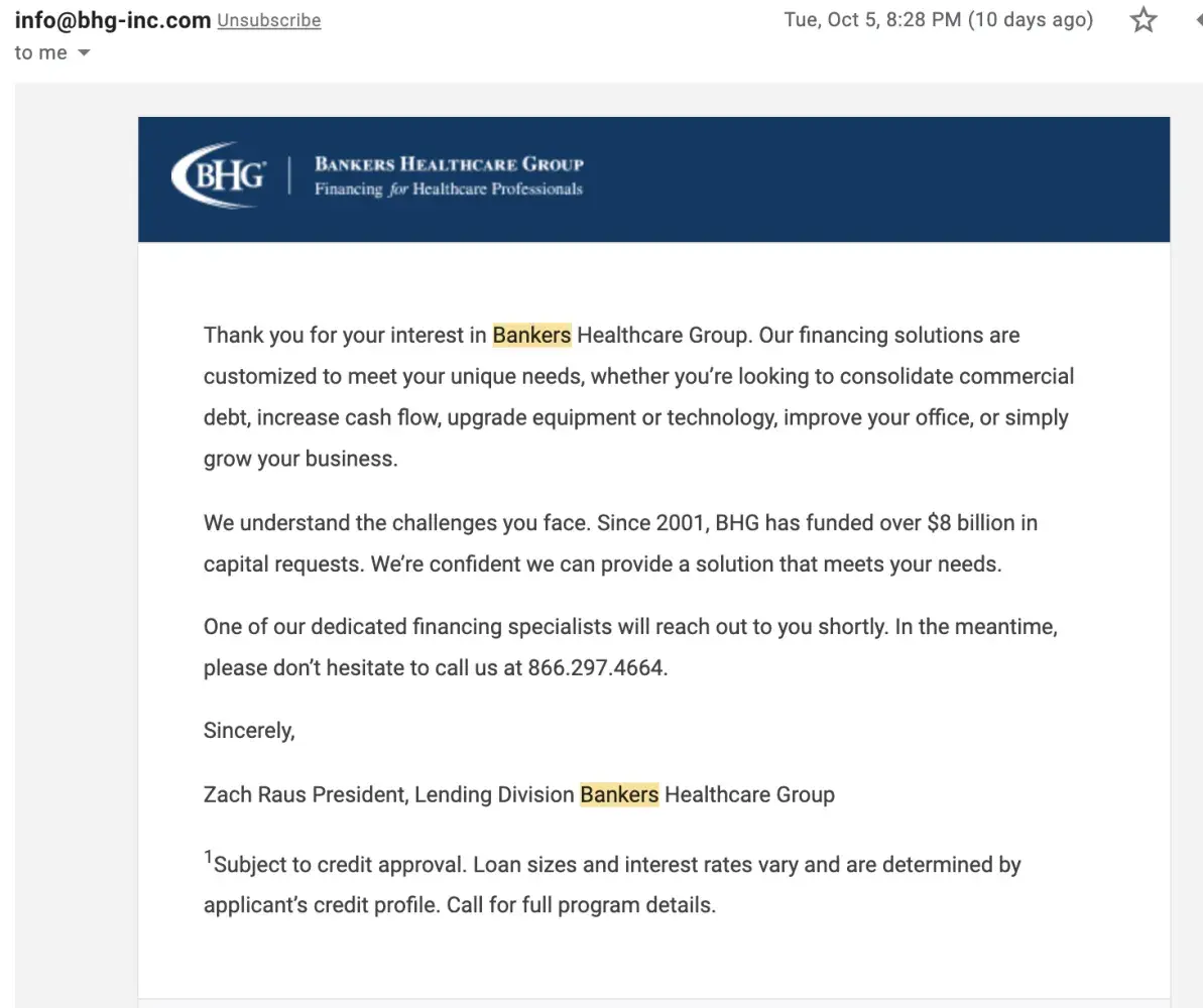 Bankers Healthcare Group, selling and cycles your personal data, to other agencies and firms. This is their main objective, they are not the least bit interested in helping you secure financing for a business. They have sold my private information, and yours as well if you have ever filled out paperwork for them. The United States government needs to step...