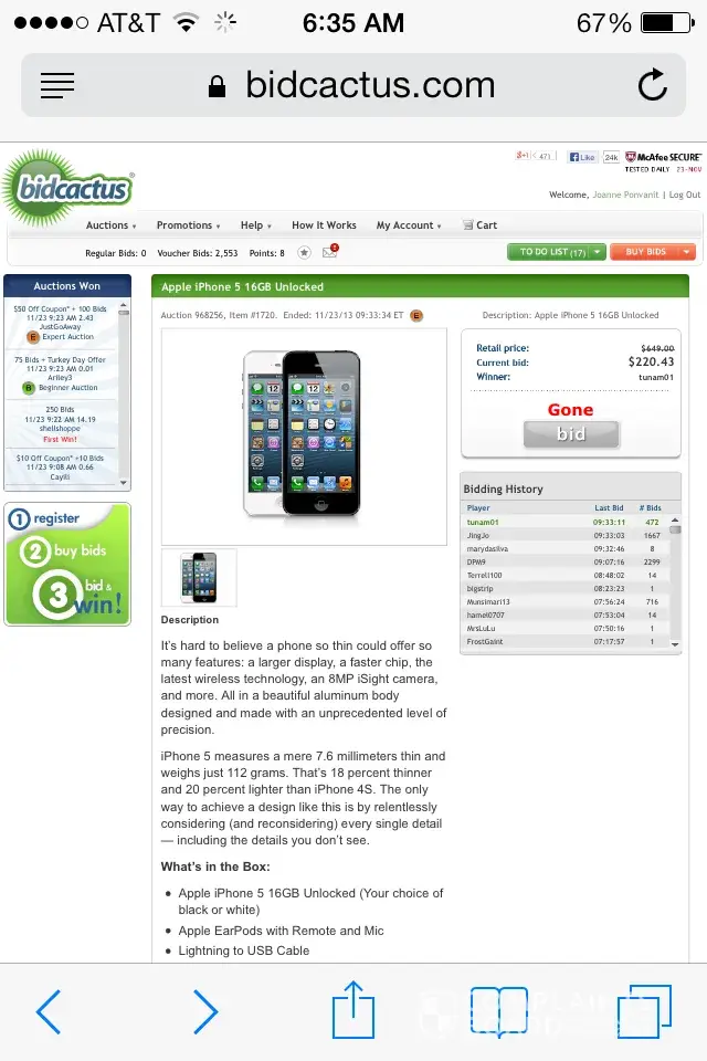 I have a proof that bidcactus is a scam. I noticed that mostly items such as Pizza Hut $10 card has an automated user setup with recurring bid counter. I placed about 40 bids on a $10 card that still had few hours to end. Can you imagine someone that will put 50+ bids counter in advance on a $10 card that is still to end in few hours. This practice was same for the other gift cards as well. Atleast one user is a system user in most of their auctions and you can literally never beat it because your bids are numbered. Good question is that why I used so many bids on one item and the answer is that I got those bids for free and wanted to test the bidcactus reality. I can swear that it is a SCAM, SCAM and only SCAM.