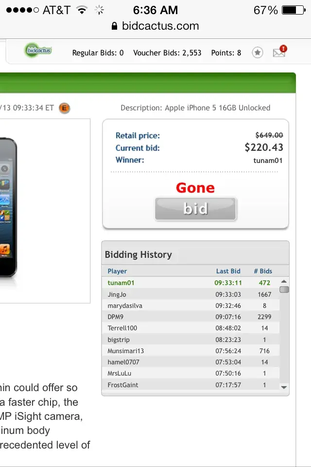 There you can see how these operates by the use of controlled bots on autobid to scam any real people into buying more and more bid packs until the reserve price has at least been met for that item that's bid on. They aren't in the business to LOSE money and will never ACTUALLY sell an item below value. If not enough real people are bidding on a particular item for a while, they will end the auction to a bot name. They will then list the bots name in the "Auction History" section to make it look as if REAL people actually win and auction is honest+fair.