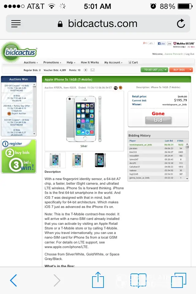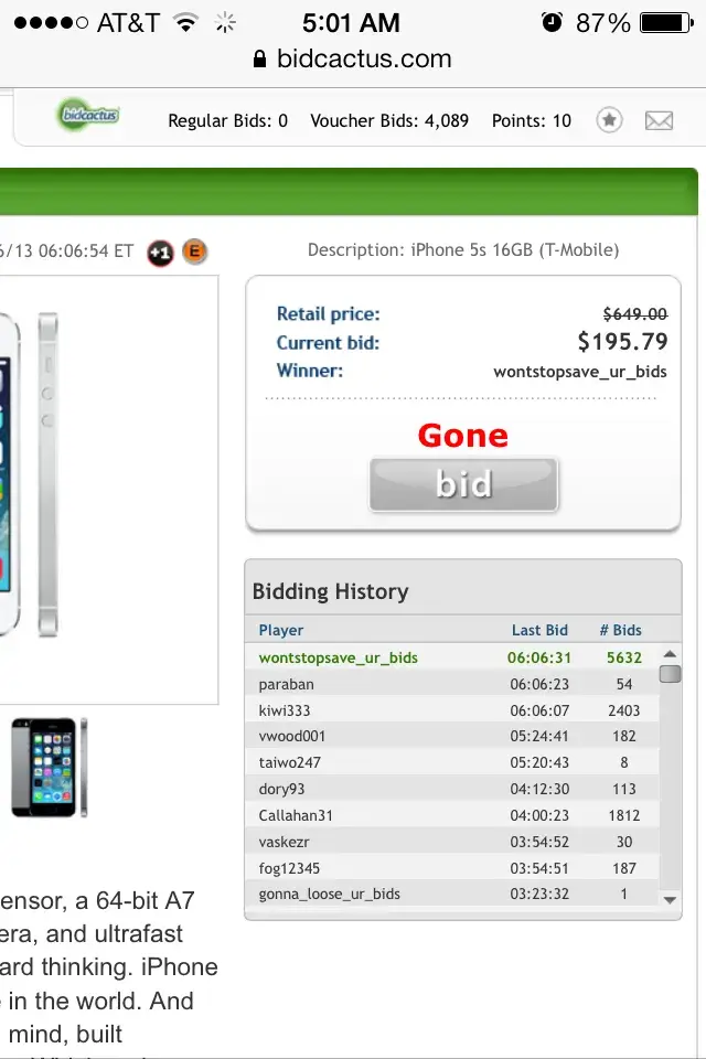 Please don't get caught in this TRAP! Hidden charges, bidding bots and paid bidders are RAMPANT! I watched this site for a few days and it is impossible for you to win items at a reasonable price. The company's bidders usually win the auction, so technically they sell the same item over and over again I observed an auction where someone paid over retail price for an iPhone 4s. Why would anyone do that? Beware of anyone with a user name that sounds daunting, or that has Capital letters in it. These are computer generated bidders, which will rob you blind.