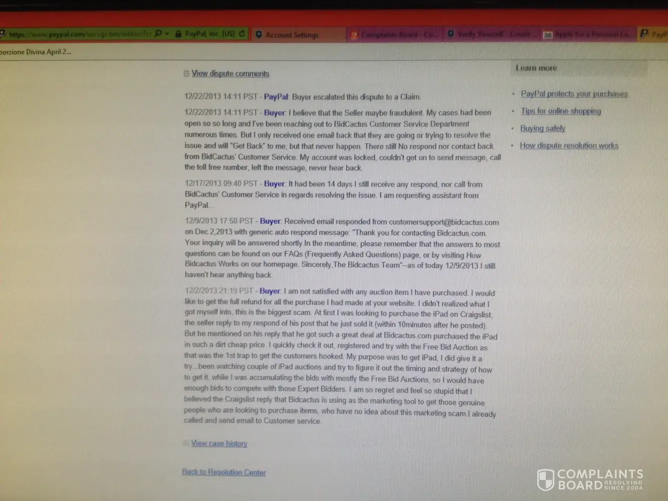 On 12/2/2013 21:19 PST I filed the claimed disputed the transaction via "PayPal Resolution Center" after I had been very frustrated with BidCactus. I would like to get the full refund for all the purchase I had made at your website, as on their site indicated that "Satisfaction Guarantee", which is totally a lie! I didn't realized what I got myself into...