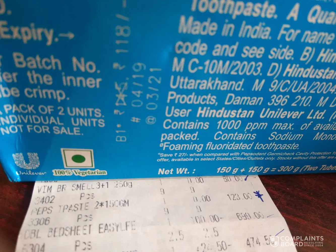 Wrong billing. The actual price of pepsodent 150×2 grams was Rs 118. But billing came Rs 123.