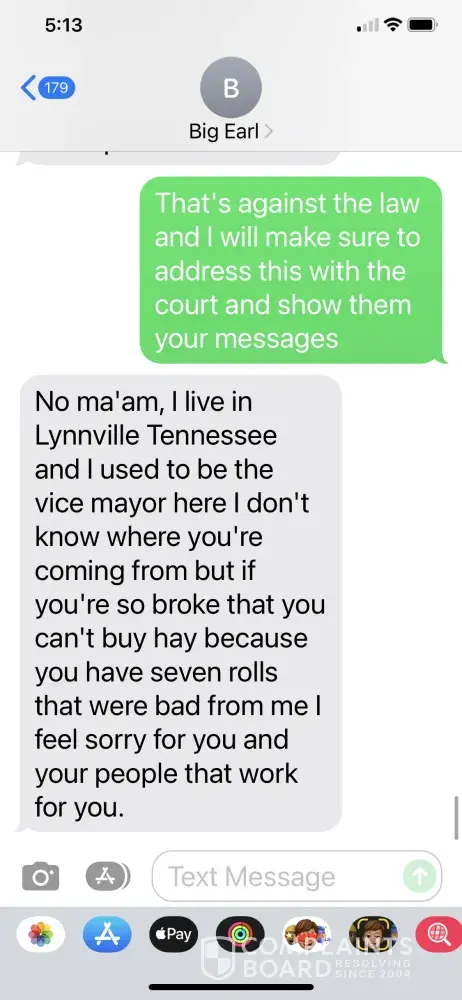 Big Earl knowing delivered me hay that was dirty and not for horses and charged me $5100. Afterwards, he told me he did not have hay for me when I was on a regular schedule, but his friend had a load. It sat outside in the weather to even make this hay better quality (insert sarcasm). Granted, I do not like to change all of my horse's feed or hay because it can cause them to colic and die. We ended up burning. Most of the hay and he wanted to CHARGE us to bring another load, but once my suppliers try and get something buy me, I will not ever deal with them again. We really took a risk feeding them bc we did not know it was stored outside.